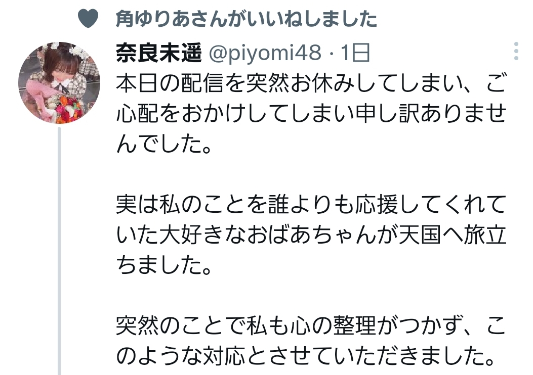 NGT48奈良未遥「おばあちゃんが天国へ旅立ちました」→NGTキャプテン角ゆりあ「いいね!」 投稿日 2021年9月6日 11:50:23 (AKB関連) Tweet スポンサードリンク 続きを読む Source: AKB48タイムズ(AKB48まとめ) スポンサードリンク 続きを読む>> 最新情報 【朗報】AKB48のマレーシアイベント、大盛況で無事に終了!!! 【画像】この子アイドルで通用しますか?【HKT487期研究生 江浦優香13才】 【朗報】外ドラマ出演のAKB48山﨑空ちゃんの演技が上手いと話題に【あなたの恋人、強奪します。/そらら】 【朗報】近々新曲のMV撮影が行われる模様!【AKB48】 【朗報】19期研究生全員当たり!!!【AKB48劇場公演デビュー】 【朗報】ベルク×ニップン「AKB48 17期生 もちっとおいしいコラボキャンペーン」がスタート!!! 【速報】最新の久保怜音さんがキタ━━━━(゚∀゚)━━━━!!【元AKB48さとぴー】 【速報】STU48森下舞羽が卒業発表!!【まいはっち】 【AKB48】村山彩希さん、ついにインスタの個人アカウントを作る!!【ゆいリーInstagramデビュー】 【AKB48】クアラルンプール2日目、髙橋彩音ちゃんにぶっかけられて喜ぶ現地民をご覧下さい【マレーシア】 【悲報】地下アイドル現場怖い😱 女優業って正直ファンとしては辛い事ばかりで全然嬉しくないよね?【AKB48/SKE48/NMB48/HKT48/NGT48/STU48】 【朗報】元AKB48チームTP・邱品涵さん、福岡ソフトバンクホークスのチアガールに転身し大成功!!! 【AKB48】卒業記念生写真を出せるメンバーの基準ってどうなってんの? 【朗報】元AKB48奥原妃奈子さん、渋谷の大型ビジョンに現れる!【元チーム8ひーな】 昨日は岡田パッパの誕生日です【元AKB48岡田奈々】 【悲報】アイドルさん、ビラ配り中にまたしても酷い目に遭ってしまう【カリギュラのぶちあげイエロー担当ゆめぴりか】 【朗報】NGT48奈良未遥、ファースト写真集「こんな風に見られているのか?」7月1日発売決定!!! 【KLP48】クアラルンプール2日目に起こりそうなこと【AKB48】 今度こそ正真正銘のずっきーの谷間キタあああああ?【AKB48山内瑞葵】 【衝撃】松井珠理奈がアイドル復帰!マレーシア初の48姉妹グループ・KLP48プレイングマネージャーに就任決定!正式発表【元SKE48】 【AKB48】オリジナルステッカー販売終了のお知らせ【ピンポン玉チャレンジ】 【朗報】元馬嘉伶の真楪伶が1st写真集を発売決定!!【元AKB48・元まちゃりん・奇跡と出会った瞬間】 初めてAKB48劇場に入る私にアドバイス下さい!! スクエニ『トワツガイ』が僅か1年でサービス終了!大西桃香、渡辺みり愛、長谷川玲奈が実写化したのに【舞台化・元AKB48/元乃木坂46/元NGT48】 【悲報】=LOVE大谷映美里、体調不良のため本日の「個別お話し会」を欠席・・・【指原莉乃プロデュースアイドル・イコラブ・イコールラブ】 「ゆいずき」のダブルセンターというAKB48最強のカード【小栗有以・山内瑞葵】 【朗報】AKB48橋本陽菜、マレーシア移籍は断ったけど、旅行気分の数日間なら喜ぶ!!【はるぴょん】 【AKB48】メンバーが公演後に受け取ったファンレターをうpしてるのだが、どう思う? 【AKB48】正鋳真優「いつかAKBにチーム制を復活させたい」【まさるさん】 SKE48写真集「ずぶ濡れSKE48」が9月27日に発売!!! バラドル界、「朝日奈央」「渋谷凪沙」の2強時代へ