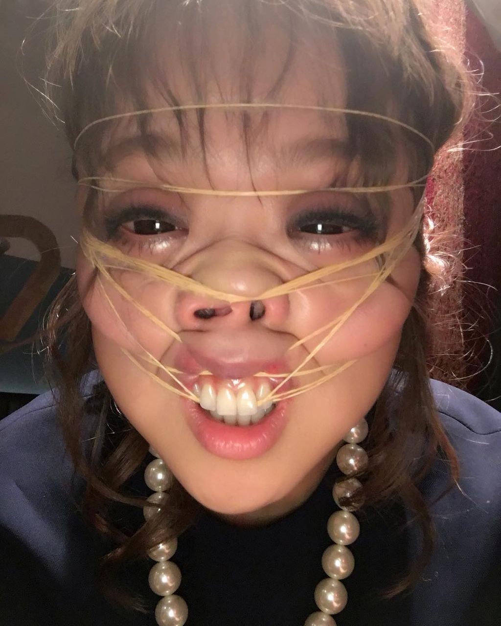 瞼や頬が不自然に盛り上がり、鼻はゴムの圧力で完全につぶされている。彼女自身も自分の顔に、「#変顔はやりすぎると怖い」とコメントする事態。