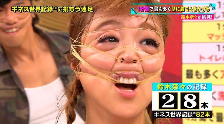 鈴木は、「輪ゴムを使って最強の変顔に、挑戦してみました〜」と、いくつもの輪ゴムを顔中に巻き付けた衝撃的な姿を公開。