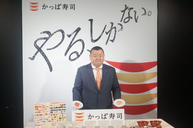 大野賢一社長。社長の背後には「やる、しかない」の文字。まさにかっぱ寿司の今を表したメッセージだ