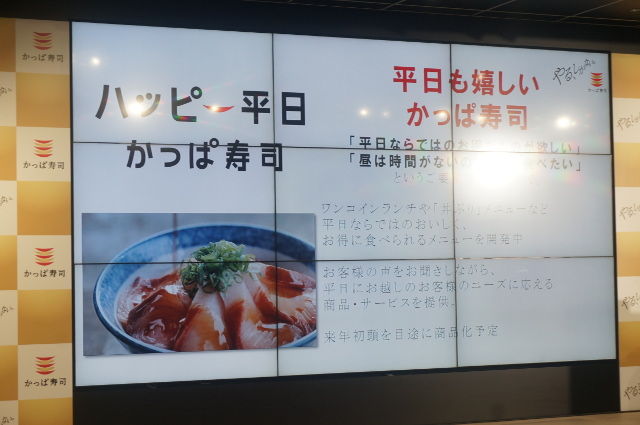 今回の発表では、別の取組みも発表されている。それは、寿司一貫を一皿50円で提供するトライアルを11月下旬から一部店舗で開始すること、平日昼限定のランチメニューやサービスを提供する「ハッピー平日かっぱ寿司」を2018年1月から開始することだ。いずれも「新しいかっぱ寿司を知ってもらう」ための関連施策として位置づけることが可能だ。