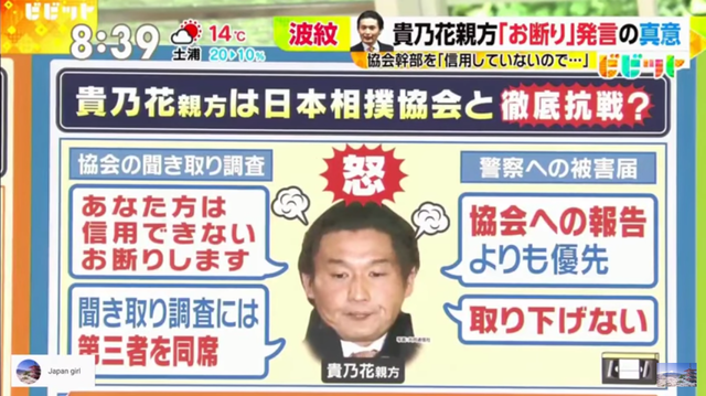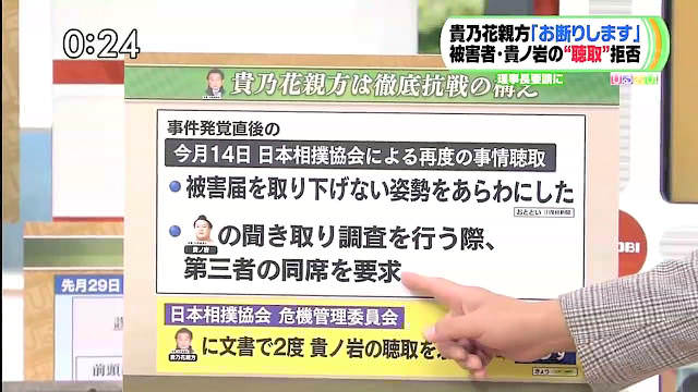 > 春日野広報部長(元関脇栃乃和歌)によると、一部報道でこの問題が発覚した14日、協会の事情聴取に対して貴乃花親方は「(第三者を)立てなければいけないようになるかもしれない」と発言した。