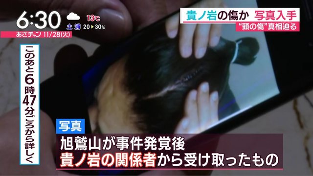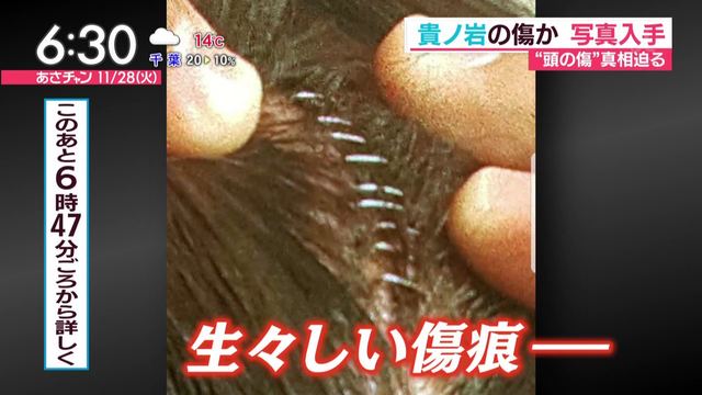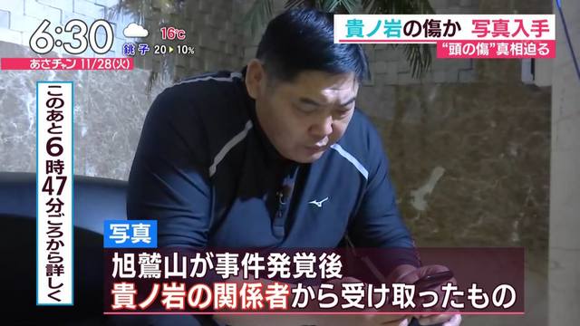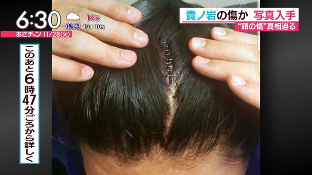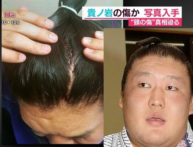 旭鷲山によりますと、写真は関係者から送られてきたもので、貴ノ岩関とみられる人物の頭部には裂傷が見られ、医療用ホチキスが10針程、打たれている様子がうかがえます。