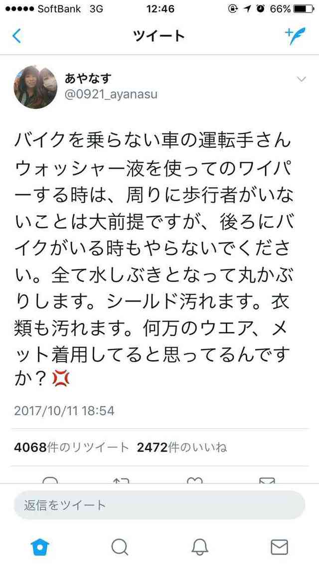 バイクはすり抜けで路肩から小石飛ばして車傷つけてるんだからウォッシャー液くらい我慢しろ
