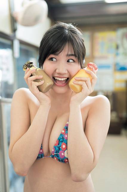 レトロな雰囲気漂う銭湯で、キュートな笑顔と美バストを披露している。