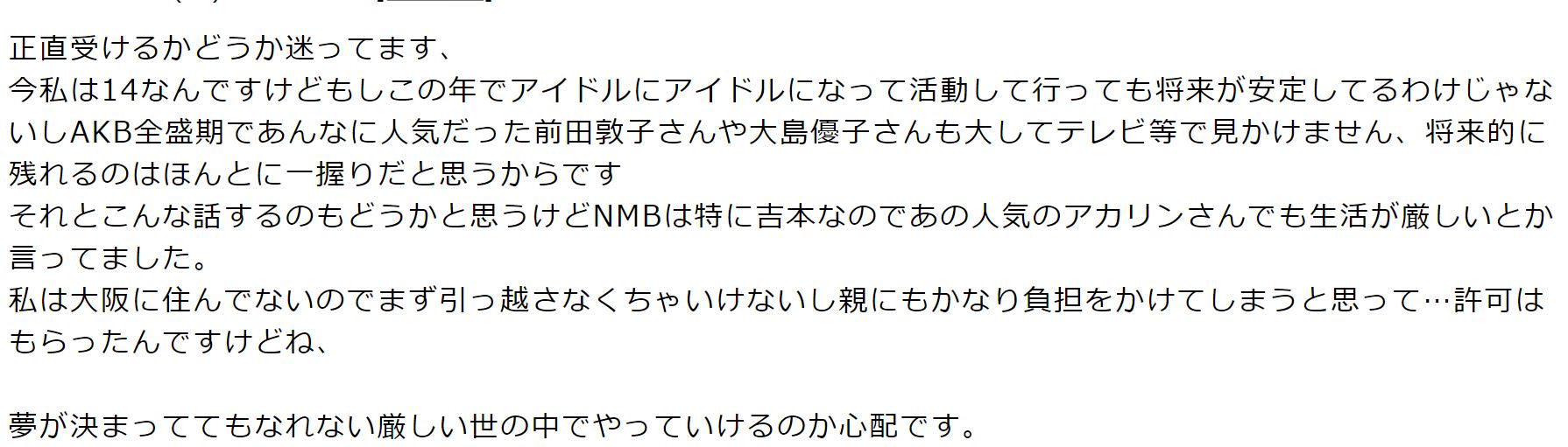 14歳オーデ受験生「48グループに入っても未来はない」【AKB48/SKE48/NMB48/HKT48/NGT48/STU48/チーム8/乃木坂46/欅坂46/けやき坂46】