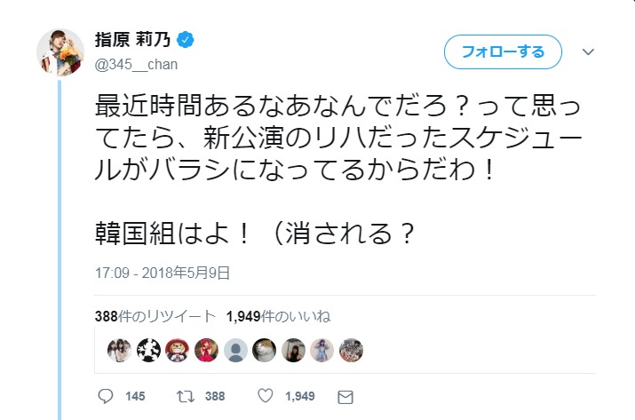 【HKT48】指原莉乃「最近時間あるなあなんでだろ?って思ってたら、新公演のリハだったスケジュールがバラシになってるからだわ!韓国組はよ!(消される?」【さっしー】 投稿日 2018年5月10日 19:37:17 (AKB関連) Tweet スポンサードリンク 続きを読む Source: AKB48タイムズ(AKB48まとめ) スポンサードリンク 続きを読む>> 最新情報 【朗報】AKB48のマレーシアイベント、大盛況で無事に終了!!! 【画像】この子アイドルで通用しますか?【HKT487期研究生 江浦優香13才】 【朗報】外ドラマ出演のAKB48山﨑空ちゃんの演技が上手いと話題に【あなたの恋人、強奪します。/そらら】 【朗報】近々新曲のMV撮影が行われる模様!【AKB48】 【朗報】19期研究生全員当たり!!!【AKB48劇場公演デビュー】 【朗報】ベルク×ニップン「AKB48 17期生 もちっとおいしいコラボキャンペーン」がスタート!!! 【速報】最新の久保怜音さんがキタ━━━━(゚∀゚)━━━━!!【元AKB48さとぴー】 【速報】STU48森下舞羽が卒業発表!!【まいはっち】 【AKB48】村山彩希さん、ついにインスタの個人アカウントを作る!!【ゆいリーInstagramデビュー】 【AKB48】クアラルンプール2日目、髙橋彩音ちゃんにぶっかけられて喜ぶ現地民をご覧下さい【マレーシア】 【悲報】地下アイドル現場怖い😱 女優業って正直ファンとしては辛い事ばかりで全然嬉しくないよね?【AKB48/SKE48/NMB48/HKT48/NGT48/STU48】 【朗報】元AKB48チームTP・邱品涵さん、福岡ソフトバンクホークスのチアガールに転身し大成功!!! 【AKB48】卒業記念生写真を出せるメンバーの基準ってどうなってんの? 【朗報】元AKB48奥原妃奈子さん、渋谷の大型ビジョンに現れる!【元チーム8ひーな】 昨日は岡田パッパの誕生日です【元AKB48岡田奈々】 【悲報】アイドルさん、ビラ配り中にまたしても酷い目に遭ってしまう【カリギュラのぶちあげイエロー担当ゆめぴりか】 【朗報】NGT48奈良未遥、ファースト写真集「こんな風に見られているのか?」7月1日発売決定!!! 【KLP48】クアラルンプール2日目に起こりそうなこと【AKB48】 今度こそ正真正銘のずっきーの谷間キタあああああ?【AKB48山内瑞葵】 【衝撃】松井珠理奈がアイドル復帰!マレーシア初の48姉妹グループ・KLP48プレイングマネージャーに就任決定!正式発表【元SKE48】 【AKB48】オリジナルステッカー販売終了のお知らせ【ピンポン玉チャレンジ】 【朗報】元馬嘉伶の真楪伶が1st写真集を発売決定!!【元AKB48・元まちゃりん・奇跡と出会った瞬間】 初めてAKB48劇場に入る私にアドバイス下さい!! スクエニ『トワツガイ』が僅か1年でサービス終了!大西桃香、渡辺みり愛、長谷川玲奈が実写化したのに【舞台化・元AKB48/元乃木坂46/元NGT48】 【悲報】=LOVE大谷映美里、体調不良のため本日の「個別お話し会」を欠席・・・【指原莉乃プロデュースアイドル・イコラブ・イコールラブ】 「ゆいずき」のダブルセンターというAKB48最強のカード【小栗有以・山内瑞葵】 【朗報】AKB48橋本陽菜、マレーシア移籍は断ったけど、旅行気分の数日間なら喜ぶ!!【はるぴょん】 【AKB48】メンバーが公演後に受け取ったファンレターをうpしてるのだが、どう思う? 【AKB48】正鋳真優「いつかAKBにチーム制を復活させたい」【まさるさん】 【悲報】チケセン選抜総選挙 推しメン席・・・【2018年第10回AKB48 53rdシングル世界選抜総選挙】 【悲報】モー娘。14のMVオーデでお馴染み渋江監督、ジャニーズキンプリデビュー曲のMVを担当するまで出世【逃した魚は大きい】