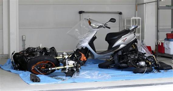 同署は報道陣にバイク3台を公開。大型バイクは大破、ミニバイクの1台は原形をとどめていなかった。