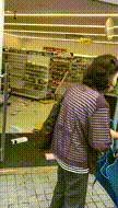 奥で商品を破壊しまくる客らしい人物が確認できる。瓶の割れる音が聞こえ、また店の入口付近にまで商品が散乱している。