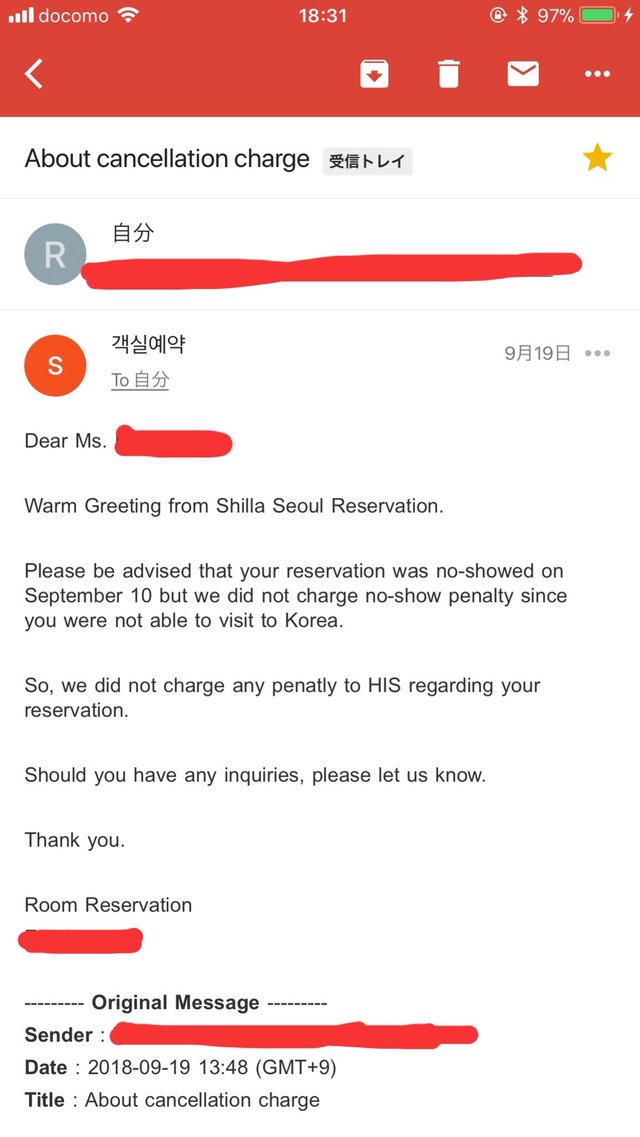 ホテル側は「9月10日に予約しておりましたが、ご都合により韓国に来ることができないことを確認しました。