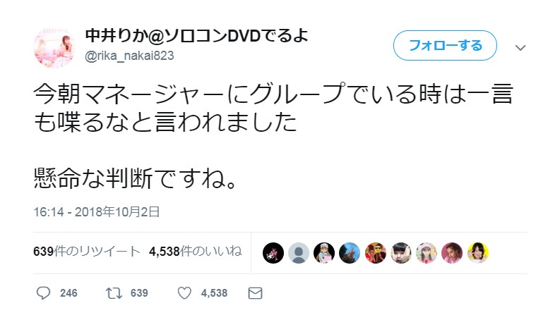 【NGT48】中井りか「グループでいる時は一言も喋るなとマネージャーに言われました。懸命な判断ですね。」【りか姫】 投稿日 2018年10月4日 14:40:37 (AKB関連) Tweet スポンサードリンク 続きを読む Source: AKB48タイムズ(AKB48まとめ) スポンサードリンク 続きを読む>> 最新情報 【朗報】AKB48のマレーシアイベント、大盛況で無事に終了!!! 【画像】この子アイドルで通用しますか?【HKT487期研究生 江浦優香13才】 【朗報】外ドラマ出演のAKB48山﨑空ちゃんの演技が上手いと話題に【あなたの恋人、強奪します。/そらら】 【朗報】近々新曲のMV撮影が行われる模様!【AKB48】 【朗報】19期研究生全員当たり!!!【AKB48劇場公演デビュー】 【朗報】ベルク×ニップン「AKB48 17期生 もちっとおいしいコラボキャンペーン」がスタート!!! 【速報】最新の久保怜音さんがキタ━━━━(゚∀゚)━━━━!!【元AKB48さとぴー】 【速報】STU48森下舞羽が卒業発表!!【まいはっち】 【AKB48】村山彩希さん、ついにインスタの個人アカウントを作る!!【ゆいリーInstagramデビュー】 【AKB48】クアラルンプール2日目、髙橋彩音ちゃんにぶっかけられて喜ぶ現地民をご覧下さい【マレーシア】 【悲報】地下アイドル現場怖い😱 女優業って正直ファンとしては辛い事ばかりで全然嬉しくないよね?【AKB48/SKE48/NMB48/HKT48/NGT48/STU48】 【朗報】元AKB48チームTP・邱品涵さん、福岡ソフトバンクホークスのチアガールに転身し大成功!!! 【AKB48】卒業記念生写真を出せるメンバーの基準ってどうなってんの? 【朗報】元AKB48奥原妃奈子さん、渋谷の大型ビジョンに現れる!【元チーム8ひーな】 昨日は岡田パッパの誕生日です【元AKB48岡田奈々】 【悲報】アイドルさん、ビラ配り中にまたしても酷い目に遭ってしまう【カリギュラのぶちあげイエロー担当ゆめぴりか】 【朗報】NGT48奈良未遥、ファースト写真集「こんな風に見られているのか?」7月1日発売決定!!! 【KLP48】クアラルンプール2日目に起こりそうなこと【AKB48】 今度こそ正真正銘のずっきーの谷間キタあああああ?【AKB48山内瑞葵】 【衝撃】松井珠理奈がアイドル復帰!マレーシア初の48姉妹グループ・KLP48プレイングマネージャーに就任決定!正式発表【元SKE48】 【AKB48】オリジナルステッカー販売終了のお知らせ【ピンポン玉チャレンジ】 【朗報】元馬嘉伶の真楪伶が1st写真集を発売決定!!【元AKB48・元まちゃりん・奇跡と出会った瞬間】 初めてAKB48劇場に入る私にアドバイス下さい!! スクエニ『トワツガイ』が僅か1年でサービス終了!大西桃香、渡辺みり愛、長谷川玲奈が実写化したのに【舞台化・元AKB48/元乃木坂46/元NGT48】 【悲報】=LOVE大谷映美里、体調不良のため本日の「個別お話し会」を欠席・・・【指原莉乃プロデュースアイドル・イコラブ・イコールラブ】 「ゆいずき」のダブルセンターというAKB48最強のカード【小栗有以・山内瑞葵】 【朗報】AKB48橋本陽菜、マレーシア移籍は断ったけど、旅行気分の数日間なら喜ぶ!!【はるぴょん】 【AKB48】メンバーが公演後に受け取ったファンレターをうpしてるのだが、どう思う? 【AKB48】正鋳真優「いつかAKBにチーム制を復活させたい」【まさるさん】 【SKE48】須田亜香里「スキャンダルなしでがむしゃらにアイドルやって、遂に載った週刊誌の記事が写真集爆死って…悔しいけど笑った」【あかりん】 カードの請求がやばいんだが
