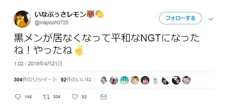 いなぷぅさレモン「黒メンが居なくなって平和なNGTになったね!やったね✌」【NGT48騒動】 投稿日 2019年4月21日 23:57:48 (AKB関連) Tweet スポンサードリンク 続きを読む Source: AKB48タイムズ(AKB48まとめ) スポンサードリンク 続きを読む>> 最新情報 【朗報】AKB48のマレーシアイベント、大盛況で無事に終了!!! 【画像】この子アイドルで通用しますか?【HKT487期研究生 江浦優香13才】 【朗報】外ドラマ出演のAKB48山﨑空ちゃんの演技が上手いと話題に【あなたの恋人、強奪します。/そらら】 【朗報】近々新曲のMV撮影が行われる模様!【AKB48】 【朗報】19期研究生全員当たり!!!【AKB48劇場公演デビュー】 【朗報】ベルク×ニップン「AKB48 17期生 もちっとおいしいコラボキャンペーン」がスタート!!! 【速報】最新の久保怜音さんがキタ━━━━(゚∀゚)━━━━!!【元AKB48さとぴー】 【速報】STU48森下舞羽が卒業発表!!【まいはっち】 【AKB48】村山彩希さん、ついにインスタの個人アカウントを作る!!【ゆいリーInstagramデビュー】 【AKB48】クアラルンプール2日目、髙橋彩音ちゃんにぶっかけられて喜ぶ現地民をご覧下さい【マレーシア】 【悲報】地下アイドル現場怖い😱 女優業って正直ファンとしては辛い事ばかりで全然嬉しくないよね?【AKB48/SKE48/NMB48/HKT48/NGT48/STU48】 【朗報】元AKB48チームTP・邱品涵さん、福岡ソフトバンクホークスのチアガールに転身し大成功!!! 【AKB48】卒業記念生写真を出せるメンバーの基準ってどうなってんの? 【朗報】元AKB48奥原妃奈子さん、渋谷の大型ビジョンに現れる!【元チーム8ひーな】 昨日は岡田パッパの誕生日です【元AKB48岡田奈々】 【悲報】アイドルさん、ビラ配り中にまたしても酷い目に遭ってしまう【カリギュラのぶちあげイエロー担当ゆめぴりか】 【朗報】NGT48奈良未遥、ファースト写真集「こんな風に見られているのか?」7月1日発売決定!!! 【KLP48】クアラルンプール2日目に起こりそうなこと【AKB48】 今度こそ正真正銘のずっきーの谷間キタあああああ?【AKB48山内瑞葵】 【衝撃】松井珠理奈がアイドル復帰!マレーシア初の48姉妹グループ・KLP48プレイングマネージャーに就任決定!正式発表【元SKE48】 【AKB48】オリジナルステッカー販売終了のお知らせ【ピンポン玉チャレンジ】 【朗報】元馬嘉伶の真楪伶が1st写真集を発売決定!!【元AKB48・元まちゃりん・奇跡と出会った瞬間】 初めてAKB48劇場に入る私にアドバイス下さい!! スクエニ『トワツガイ』が僅か1年でサービス終了!大西桃香、渡辺みり愛、長谷川玲奈が実写化したのに【舞台化・元AKB48/元乃木坂46/元NGT48】 【悲報】=LOVE大谷映美里、体調不良のため本日の「個別お話し会」を欠席・・・【指原莉乃プロデュースアイドル・イコラブ・イコールラブ】 「ゆいずき」のダブルセンターというAKB48最強のカード【小栗有以・山内瑞葵】 【朗報】AKB48橋本陽菜、マレーシア移籍は断ったけど、旅行気分の数日間なら喜ぶ!!【はるぴょん】 【AKB48】メンバーが公演後に受け取ったファンレターをうpしてるのだが、どう思う? 【AKB48】正鋳真優「いつかAKBにチーム制を復活させたい」【まさるさん】 一人暮らし俺の冷蔵庫内wwwwwwwwww X JAPAN史上最高楽曲、「Rusty Nail」に決定