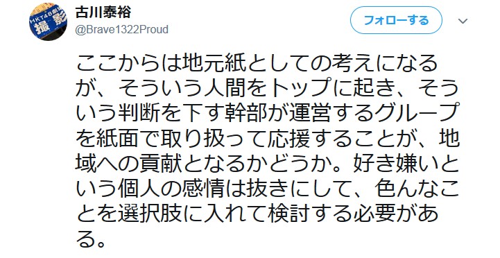 西日本スポーツHKT48担当「AKSが運営するグループを紙面で応援することが地域への貢献となるか色んなことを選択肢に検討する必要がある」【古川泰裕】 投稿日 2019年4月22日 02:44:13 (AKB関連) Tweet スポンサードリンク 続きを読む Source: AKB48タイムズ(AKB48まとめ) スポンサードリンク 続きを読む>> 最新情報 【朗報】AKB48のマレーシアイベント、大盛況で無事に終了!!! 【画像】この子アイドルで通用しますか?【HKT487期研究生 江浦優香13才】 【朗報】外ドラマ出演のAKB48山﨑空ちゃんの演技が上手いと話題に【あなたの恋人、強奪します。/そらら】 【朗報】近々新曲のMV撮影が行われる模様!【AKB48】 【朗報】19期研究生全員当たり!!!【AKB48劇場公演デビュー】 【朗報】ベルク×ニップン「AKB48 17期生 もちっとおいしいコラボキャンペーン」がスタート!!! 【速報】最新の久保怜音さんがキタ━━━━(゚∀゚)━━━━!!【元AKB48さとぴー】 【速報】STU48森下舞羽が卒業発表!!【まいはっち】 【AKB48】村山彩希さん、ついにインスタの個人アカウントを作る!!【ゆいリーInstagramデビュー】 【AKB48】クアラルンプール2日目、髙橋彩音ちゃんにぶっかけられて喜ぶ現地民をご覧下さい【マレーシア】 【悲報】地下アイドル現場怖い😱 女優業って正直ファンとしては辛い事ばかりで全然嬉しくないよね?【AKB48/SKE48/NMB48/HKT48/NGT48/STU48】 【朗報】元AKB48チームTP・邱品涵さん、福岡ソフトバンクホークスのチアガールに転身し大成功!!! 【AKB48】卒業記念生写真を出せるメンバーの基準ってどうなってんの? 【朗報】元AKB48奥原妃奈子さん、渋谷の大型ビジョンに現れる!【元チーム8ひーな】 昨日は岡田パッパの誕生日です【元AKB48岡田奈々】 【悲報】アイドルさん、ビラ配り中にまたしても酷い目に遭ってしまう【カリギュラのぶちあげイエロー担当ゆめぴりか】 【朗報】NGT48奈良未遥、ファースト写真集「こんな風に見られているのか?」7月1日発売決定!!! 【KLP48】クアラルンプール2日目に起こりそうなこと【AKB48】 今度こそ正真正銘のずっきーの谷間キタあああああ?【AKB48山内瑞葵】 【衝撃】松井珠理奈がアイドル復帰!マレーシア初の48姉妹グループ・KLP48プレイングマネージャーに就任決定!正式発表【元SKE48】 【AKB48】オリジナルステッカー販売終了のお知らせ【ピンポン玉チャレンジ】 【朗報】元馬嘉伶の真楪伶が1st写真集を発売決定!!【元AKB48・元まちゃりん・奇跡と出会った瞬間】 初めてAKB48劇場に入る私にアドバイス下さい!! スクエニ『トワツガイ』が僅か1年でサービス終了!大西桃香、渡辺みり愛、長谷川玲奈が実写化したのに【舞台化・元AKB48/元乃木坂46/元NGT48】 【悲報】=LOVE大谷映美里、体調不良のため本日の「個別お話し会」を欠席・・・【指原莉乃プロデュースアイドル・イコラブ・イコールラブ】 「ゆいずき」のダブルセンターというAKB48最強のカード【小栗有以・山内瑞葵】 【朗報】AKB48橋本陽菜、マレーシア移籍は断ったけど、旅行気分の数日間なら喜ぶ!!【はるぴょん】 【AKB48】メンバーが公演後に受け取ったファンレターをうpしてるのだが、どう思う? 【AKB48】正鋳真優「いつかAKBにチーム制を復活させたい」【まさるさん】 飯塚幸三が消したTwitter、掘られる。楽天ファン+ネトウヨだった。 ライブ中に客に向かってキレた事があるアーティスト