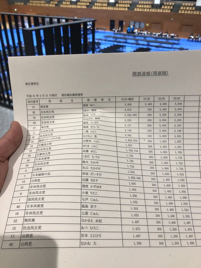 深夜0時40分の段階で1144票を獲得し、34議席中30位で当選確実の一報が入った。