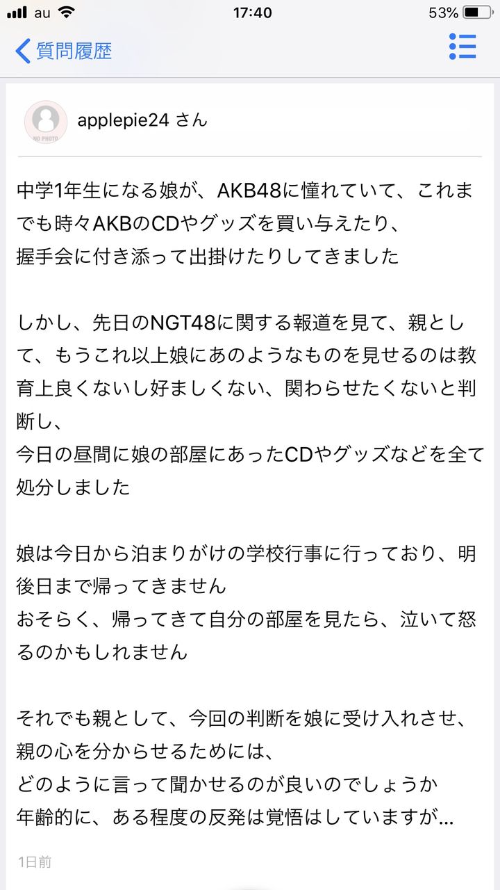 【悲報】NGT48関連の報道を受けて、娘のAKB48のCDを勝手に捨てた親がフルボッコにされる!!! 投稿日 2019年4月25日 16:33:32 (AKB関連) Tweet スポンサードリンク 続きを読む Source: AKB48タイムズ(AKB48まとめ) スポンサードリンク 続きを読む>> 最新情報 【朗報】AKB48のマレーシアイベント、大盛況で無事に終了!!! 【画像】この子アイドルで通用しますか?【HKT487期研究生 江浦優香13才】 【朗報】外ドラマ出演のAKB48山﨑空ちゃんの演技が上手いと話題に【あなたの恋人、強奪します。/そらら】 【朗報】近々新曲のMV撮影が行われる模様!【AKB48】 【朗報】19期研究生全員当たり!!!【AKB48劇場公演デビュー】 【朗報】ベルク×ニップン「AKB48 17期生 もちっとおいしいコラボキャンペーン」がスタート!!! 【速報】最新の久保怜音さんがキタ━━━━(゚∀゚)━━━━!!【元AKB48さとぴー】 【速報】STU48森下舞羽が卒業発表!!【まいはっち】 【AKB48】村山彩希さん、ついにインスタの個人アカウントを作る!!【ゆいリーInstagramデビュー】 【AKB48】クアラルンプール2日目、髙橋彩音ちゃんにぶっかけられて喜ぶ現地民をご覧下さい【マレーシア】 【悲報】地下アイドル現場怖い😱 女優業って正直ファンとしては辛い事ばかりで全然嬉しくないよね?【AKB48/SKE48/NMB48/HKT48/NGT48/STU48】 【朗報】元AKB48チームTP・邱品涵さん、福岡ソフトバンクホークスのチアガールに転身し大成功!!! 【AKB48】卒業記念生写真を出せるメンバーの基準ってどうなってんの? 【朗報】元AKB48奥原妃奈子さん、渋谷の大型ビジョンに現れる!【元チーム8ひーな】 昨日は岡田パッパの誕生日です【元AKB48岡田奈々】 【悲報】アイドルさん、ビラ配り中にまたしても酷い目に遭ってしまう【カリギュラのぶちあげイエロー担当ゆめぴりか】 【朗報】NGT48奈良未遥、ファースト写真集「こんな風に見られているのか?」7月1日発売決定!!! 【KLP48】クアラルンプール2日目に起こりそうなこと【AKB48】 今度こそ正真正銘のずっきーの谷間キタあああああ?【AKB48山内瑞葵】 【衝撃】松井珠理奈がアイドル復帰!マレーシア初の48姉妹グループ・KLP48プレイングマネージャーに就任決定!正式発表【元SKE48】 【AKB48】オリジナルステッカー販売終了のお知らせ【ピンポン玉チャレンジ】 【朗報】元馬嘉伶の真楪伶が1st写真集を発売決定!!【元AKB48・元まちゃりん・奇跡と出会った瞬間】 初めてAKB48劇場に入る私にアドバイス下さい!! スクエニ『トワツガイ』が僅か1年でサービス終了!大西桃香、渡辺みり愛、長谷川玲奈が実写化したのに【舞台化・元AKB48/元乃木坂46/元NGT48】 【悲報】=LOVE大谷映美里、体調不良のため本日の「個別お話し会」を欠席・・・【指原莉乃プロデュースアイドル・イコラブ・イコールラブ】 「ゆいずき」のダブルセンターというAKB48最強のカード【小栗有以・山内瑞葵】 【朗報】AKB48橋本陽菜、マレーシア移籍は断ったけど、旅行気分の数日間なら喜ぶ!!【はるぴょん】 【AKB48】メンバーが公演後に受け取ったファンレターをうpしてるのだが、どう思う? 【AKB48】正鋳真優「いつかAKBにチーム制を復活させたい」【まさるさん】 滝沢秀明、新体制で加速?山下智久や木村拓哉…ベテランの「バラエティ進出」 【NGT48】高橋真麻、AKSに疑問「グチャグチャな舞台を自分の著作権で出して…意味がわからない」【山口真帆・まほほん】