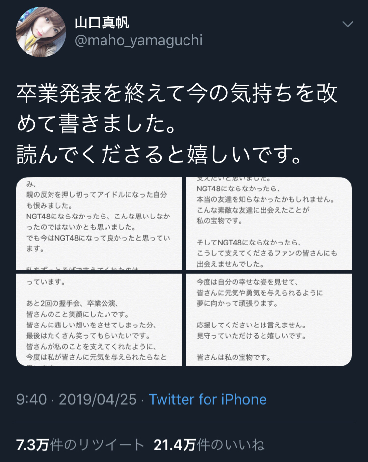 【速報】NGT48山口真帆のツイートのいいねが29.4万、リツイートも9.3万を超える!いいね数がAKB48グループ歴代1位に!!! 投稿日 2019年4月26日 01:26:17 (AKB関連) Tweet スポンサードリンク 続きを読む Source: AKB48タイムズ(AKB48まとめ) スポンサードリンク 続きを読む>> 最新情報 【朗報】AKB48のマレーシアイベント、大盛況で無事に終了!!! 【画像】この子アイドルで通用しますか?【HKT487期研究生 江浦優香13才】 【朗報】外ドラマ出演のAKB48山﨑空ちゃんの演技が上手いと話題に【あなたの恋人、強奪します。/そらら】 【朗報】近々新曲のMV撮影が行われる模様!【AKB48】 【朗報】19期研究生全員当たり!!!【AKB48劇場公演デビュー】 【朗報】ベルク×ニップン「AKB48 17期生 もちっとおいしいコラボキャンペーン」がスタート!!! 【速報】最新の久保怜音さんがキタ━━━━(゚∀゚)━━━━!!【元AKB48さとぴー】 【速報】STU48森下舞羽が卒業発表!!【まいはっち】 【AKB48】村山彩希さん、ついにインスタの個人アカウントを作る!!【ゆいリーInstagramデビュー】 【AKB48】クアラルンプール2日目、髙橋彩音ちゃんにぶっかけられて喜ぶ現地民をご覧下さい【マレーシア】 【悲報】地下アイドル現場怖い😱 女優業って正直ファンとしては辛い事ばかりで全然嬉しくないよね?【AKB48/SKE48/NMB48/HKT48/NGT48/STU48】 【朗報】元AKB48チームTP・邱品涵さん、福岡ソフトバンクホークスのチアガールに転身し大成功!!! 【AKB48】卒業記念生写真を出せるメンバーの基準ってどうなってんの? 【朗報】元AKB48奥原妃奈子さん、渋谷の大型ビジョンに現れる!【元チーム8ひーな】 昨日は岡田パッパの誕生日です【元AKB48岡田奈々】 【悲報】アイドルさん、ビラ配り中にまたしても酷い目に遭ってしまう【カリギュラのぶちあげイエロー担当ゆめぴりか】 【朗報】NGT48奈良未遥、ファースト写真集「こんな風に見られているのか?」7月1日発売決定!!! 【KLP48】クアラルンプール2日目に起こりそうなこと【AKB48】 今度こそ正真正銘のずっきーの谷間キタあああああ?【AKB48山内瑞葵】 【衝撃】松井珠理奈がアイドル復帰!マレーシア初の48姉妹グループ・KLP48プレイングマネージャーに就任決定!正式発表【元SKE48】 【AKB48】オリジナルステッカー販売終了のお知らせ【ピンポン玉チャレンジ】 【朗報】元馬嘉伶の真楪伶が1st写真集を発売決定!!【元AKB48・元まちゃりん・奇跡と出会った瞬間】 初めてAKB48劇場に入る私にアドバイス下さい!! スクエニ『トワツガイ』が僅か1年でサービス終了!大西桃香、渡辺みり愛、長谷川玲奈が実写化したのに【舞台化・元AKB48/元乃木坂46/元NGT48】 【悲報】=LOVE大谷映美里、体調不良のため本日の「個別お話し会」を欠席・・・【指原莉乃プロデュースアイドル・イコラブ・イコールラブ】 「ゆいずき」のダブルセンターというAKB48最強のカード【小栗有以・山内瑞葵】 【朗報】AKB48橋本陽菜、マレーシア移籍は断ったけど、旅行気分の数日間なら喜ぶ!!【はるぴょん】 【AKB48】メンバーが公演後に受け取ったファンレターをうpしてるのだが、どう思う? 【AKB48】正鋳真優「いつかAKBにチーム制を復活させたい」【まさるさん】 椎名林檎って「勝訴ストリップ」までは天才だと思う 【池袋上級殺人】井上トシユキ氏『権力者を叩くことで溜飲を下げたい、まぁ貧乏人の憂さ晴らしですねw』