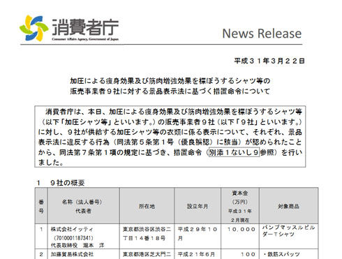 消費者庁は3月22日、いわゆる「加圧シャツ」の販売事業者9社に対し、景品表示法に違反しているとして、再発防止などを求める措置命令を下しました。9社の中には、あの「漫画村」に広告を出稿していた企業も含まれていました。