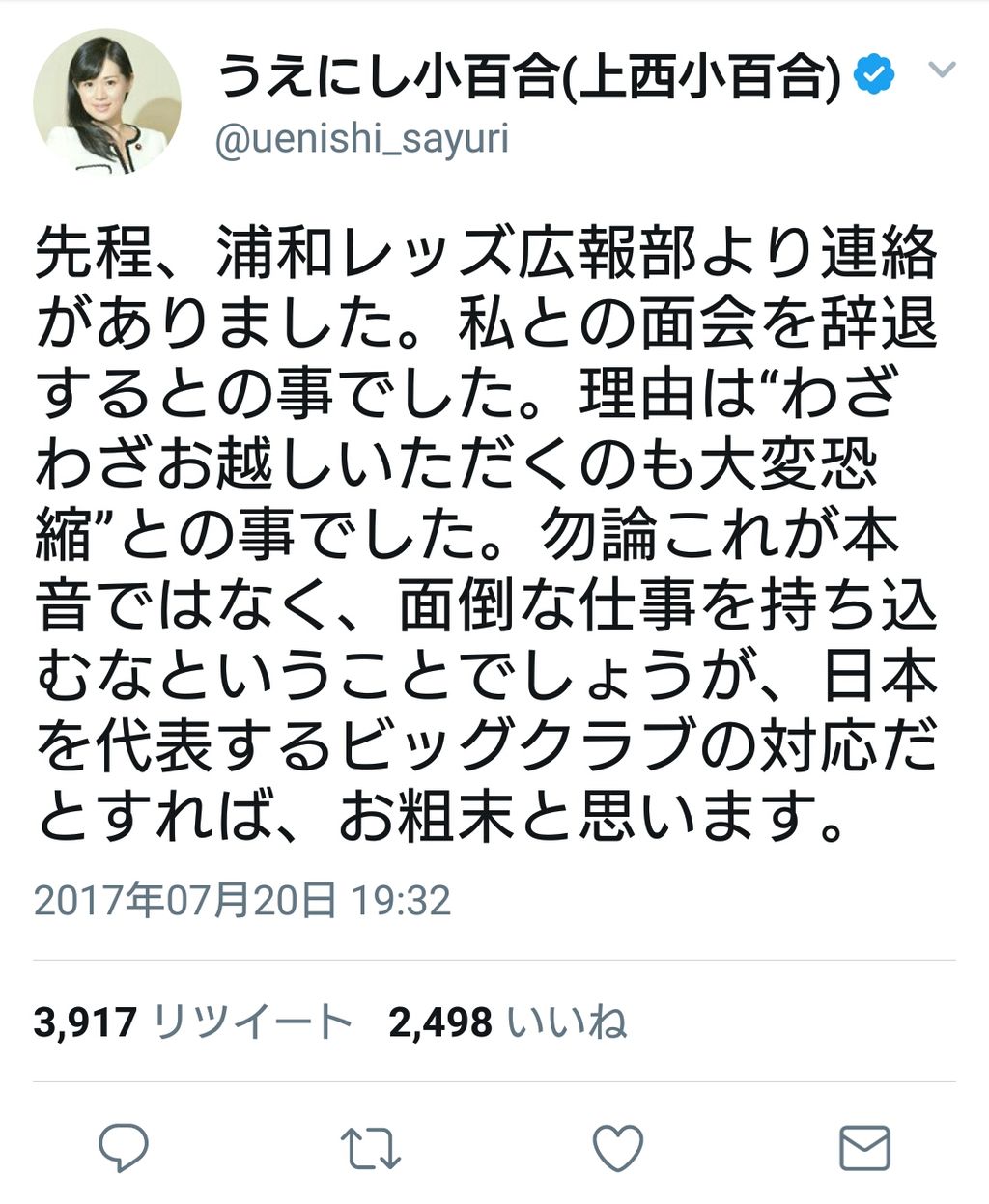 上西小百合氏(34)が22日、ツイッター上で「くたばれレッズ!」と浦和レッズへの批判を展開した。