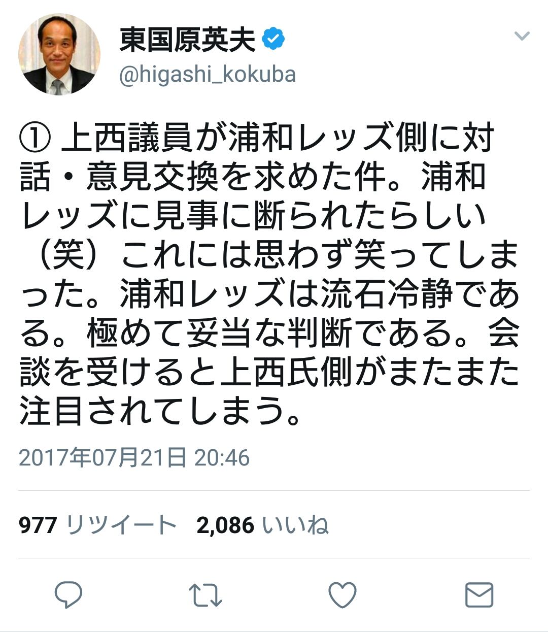 またこの日、上西氏の事務所に浦和レッズファンを名乗る人物が押しかけてきたことも明かした。