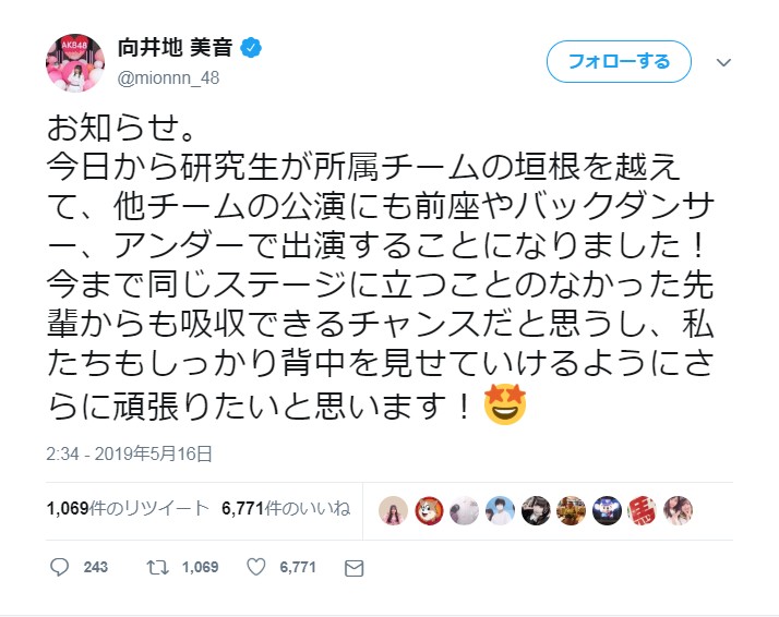【朗報】AKB48向井地美音「今日から研究生が所属チームの垣根を越えて他チームの公演にも前座やバックダンサー、アンダーで出演することになりました」【みーおん】 投稿日 2019年5月17日 17:51:30 (AKB関連) Tweet スポンサードリンク 続きを読む Source: AKB48タイムズ(AKB48まとめ) スポンサードリンク 続きを読む>> 最新情報 【朗報】AKB48のマレーシアイベント、大盛況で無事に終了!!! 【画像】この子アイドルで通用しますか?【HKT487期研究生 江浦優香13才】 【朗報】外ドラマ出演のAKB48山﨑空ちゃんの演技が上手いと話題に【あなたの恋人、強奪します。/そらら】 【朗報】近々新曲のMV撮影が行われる模様!【AKB48】 【朗報】19期研究生全員当たり!!!【AKB48劇場公演デビュー】 【朗報】ベルク×ニップン「AKB48 17期生 もちっとおいしいコラボキャンペーン」がスタート!!! 【速報】最新の久保怜音さんがキタ━━━━(゚∀゚)━━━━!!【元AKB48さとぴー】 【速報】STU48森下舞羽が卒業発表!!【まいはっち】 【AKB48】村山彩希さん、ついにインスタの個人アカウントを作る!!【ゆいリーInstagramデビュー】 【AKB48】クアラルンプール2日目、髙橋彩音ちゃんにぶっかけられて喜ぶ現地民をご覧下さい【マレーシア】 【悲報】地下アイドル現場怖い😱 女優業って正直ファンとしては辛い事ばかりで全然嬉しくないよね?【AKB48/SKE48/NMB48/HKT48/NGT48/STU48】 【朗報】元AKB48チームTP・邱品涵さん、福岡ソフトバンクホークスのチアガールに転身し大成功!!! 【AKB48】卒業記念生写真を出せるメンバーの基準ってどうなってんの? 【朗報】元AKB48奥原妃奈子さん、渋谷の大型ビジョンに現れる!【元チーム8ひーな】 昨日は岡田パッパの誕生日です【元AKB48岡田奈々】 【悲報】アイドルさん、ビラ配り中にまたしても酷い目に遭ってしまう【カリギュラのぶちあげイエロー担当ゆめぴりか】 【朗報】NGT48奈良未遥、ファースト写真集「こんな風に見られているのか?」7月1日発売決定!!! 【KLP48】クアラルンプール2日目に起こりそうなこと【AKB48】 今度こそ正真正銘のずっきーの谷間キタあああああ?【AKB48山内瑞葵】 【衝撃】松井珠理奈がアイドル復帰!マレーシア初の48姉妹グループ・KLP48プレイングマネージャーに就任決定!正式発表【元SKE48】 【AKB48】オリジナルステッカー販売終了のお知らせ【ピンポン玉チャレンジ】 【朗報】元馬嘉伶の真楪伶が1st写真集を発売決定!!【元AKB48・元まちゃりん・奇跡と出会った瞬間】 初めてAKB48劇場に入る私にアドバイス下さい!! スクエニ『トワツガイ』が僅か1年でサービス終了!大西桃香、渡辺みり愛、長谷川玲奈が実写化したのに【舞台化・元AKB48/元乃木坂46/元NGT48】 【悲報】=LOVE大谷映美里、体調不良のため本日の「個別お話し会」を欠席・・・【指原莉乃プロデュースアイドル・イコラブ・イコールラブ】 「ゆいずき」のダブルセンターというAKB48最強のカード【小栗有以・山内瑞葵】 【朗報】AKB48橋本陽菜、マレーシア移籍は断ったけど、旅行気分の数日間なら喜ぶ!!【はるぴょん】 【AKB48】メンバーが公演後に受け取ったファンレターをうpしてるのだが、どう思う? 【AKB48】正鋳真優「いつかAKBにチーム制を復活させたい」【まさるさん】 【AKB48G】浴衣握手会が爆売れ!!!【AKB48/SKE48/NMB48/HKT48/NGT48/STU48/チーム8】 最近のヤンジャン表紙がHすぎwwwwwww