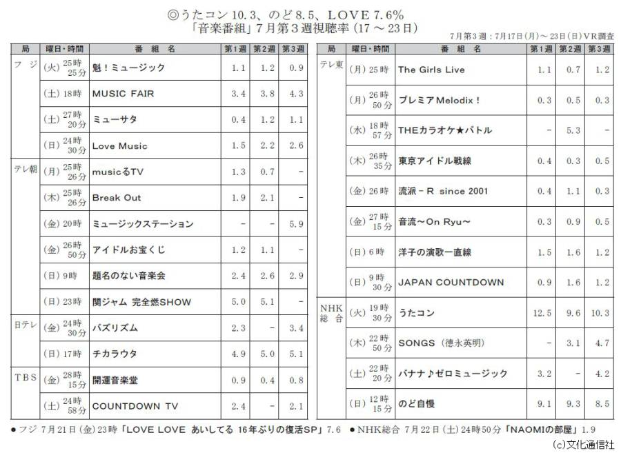 7月に放送された音楽番組の視聴率が発表された件 投稿日 2017年7月26日 00:05:47 (歌手・アーティスト) Tweet スポンサードリンク 1: 2017/07/25(火) 10:33:13.29 0.net 続きを読む Source: V系まとめ速報 スポンサードリンク 続きを読む>> 最新情報 アリアナ・グランデ、ファンからライヴでオートチューンを使っていると苦言を呈されたことに反論 【音楽】竹内まりや、39年ぶりのライブハウス公演決定!バンマスは山下達郎 ビートルズ『アビイ・ロード』50周年記念盤 9・27全世界同時発売決定 ピクシーズ、3年ぶりの来日公演が決定 パプリカで人気の米津玄師、YouTube公式チャンネル登録者数400万人突破 71歳小田和正「また会おう」55万人動員の1年3カ月ツアー完走 シンディ・ローパー来日公演、東京2デイズ即完につき追加公演が決定 「冷たいキス」ICE BOX、25年ぶり再結成 吉岡忍、伊秩弘将、中西圭三、池田聡らミニライブ開催 新曲も披露 スピッツの約3年ぶり新アルバム『見っけ』、10月リリース 細野晴臣ベストアルバム2作連続リリース、選曲は星野源&小山田圭吾 【音楽】HYDE、最初に買った音楽は「オフコース」意外?なオフコース愛告白「ラルクの初期の歌詞も、かなり影響を受けてる」 あいみょん、「マリーゴールド」が1億再生突破 こういうところでは嫌われがちだけど実際のところ星野源の音楽っていいよな 山下達郎、気管支炎のため中野サンプラザホール公演中止 【音楽】ザ・ドアーズ最初期のレア・ライヴ音源を収めたオフィシャル盤『London Fog 1966』 CD単品版発売 【音楽】三木道三改めDOZAN11、「新しい未来」配信 2019/07/10 【音楽】今年もボン・ジョヴィ「Livin' On A Prayer」で盆踊り?中野駅前大盆踊り大会開催決定 “盆ジョヴィ”再びか? ギターの音色が好きなギタリスト・嫌いなギタリスト 音楽よりTシャツだけが有名なバンド一覧 中学生でスティービーワンダーの音楽性に目覚めると言うのは異常かな?BOOOYとかは全く興味無かった 「EARTHSHAKER」ボーカル西田昌史還暦ライブにレジェンド集結 GLAYがFNSうたの夏まつりに出演。『サバイバル』を披露するそうです。 陰キャ「RADは『君の名は。』まで無名だった」 中島みゆきってめっちゃいい曲作るやん 好きなV系の曲を BUMPで最大の名曲 【悲報】ワイ、女の子にカラオケで『Lemon』の替え歌告白するもフラれる・・・ HEY-SMITHの猪狩秀平、尿管結石と診断され自宅療養→セカンドオピニオンで肺気胸と判明し、即入院で手術。 お前ら「アジカンはいいぞ」ワイ「けしてえええええ!の一発屋」 米津玄師の新曲「馬と鹿」が大泉洋主演ドラマ「ノーサイド・ゲーム」主題歌に 【ソースは公式】AKB48の組閣が秒読み段階?【細井孝宏支配人】 聴いたことのない名盤が多すぎて自分の音楽への無知さが情けない
