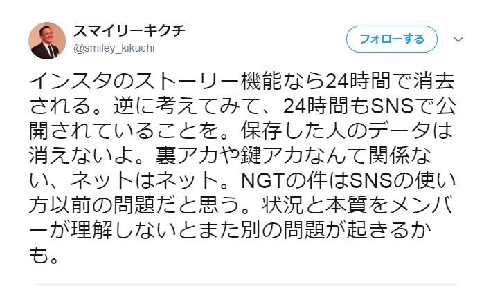 【悲報】NGT48の黒メンヲタが事あるごとに引用していたスマイリーキクチが加藤美南を批判!!! 投稿日 2019年5月23日 16:37:17 (AKB関連) Tweet スポンサードリンク 続きを読む Source: AKB48タイムズ(AKB48まとめ) スポンサードリンク 続きを読む>> 最新情報 【朗報】AKB48のマレーシアイベント、大盛況で無事に終了!!! 【画像】この子アイドルで通用しますか?【HKT487期研究生 江浦優香13才】 【朗報】外ドラマ出演のAKB48山﨑空ちゃんの演技が上手いと話題に【あなたの恋人、強奪します。/そらら】 【朗報】近々新曲のMV撮影が行われる模様!【AKB48】 【朗報】19期研究生全員当たり!!!【AKB48劇場公演デビュー】 【朗報】ベルク×ニップン「AKB48 17期生 もちっとおいしいコラボキャンペーン」がスタート!!! 【速報】最新の久保怜音さんがキタ━━━━(゚∀゚)━━━━!!【元AKB48さとぴー】 【速報】STU48森下舞羽が卒業発表!!【まいはっち】 【AKB48】村山彩希さん、ついにインスタの個人アカウントを作る!!【ゆいリーInstagramデビュー】 【AKB48】クアラルンプール2日目、髙橋彩音ちゃんにぶっかけられて喜ぶ現地民をご覧下さい【マレーシア】 【悲報】地下アイドル現場怖い😱 女優業って正直ファンとしては辛い事ばかりで全然嬉しくないよね?【AKB48/SKE48/NMB48/HKT48/NGT48/STU48】 【朗報】元AKB48チームTP・邱品涵さん、福岡ソフトバンクホークスのチアガールに転身し大成功!!! 【AKB48】卒業記念生写真を出せるメンバーの基準ってどうなってんの? 【朗報】元AKB48奥原妃奈子さん、渋谷の大型ビジョンに現れる!【元チーム8ひーな】 昨日は岡田パッパの誕生日です【元AKB48岡田奈々】 【悲報】アイドルさん、ビラ配り中にまたしても酷い目に遭ってしまう【カリギュラのぶちあげイエロー担当ゆめぴりか】 【朗報】NGT48奈良未遥、ファースト写真集「こんな風に見られているのか?」7月1日発売決定!!! 【KLP48】クアラルンプール2日目に起こりそうなこと【AKB48】 今度こそ正真正銘のずっきーの谷間キタあああああ?【AKB48山内瑞葵】 【衝撃】松井珠理奈がアイドル復帰!マレーシア初の48姉妹グループ・KLP48プレイングマネージャーに就任決定!正式発表【元SKE48】 【AKB48】オリジナルステッカー販売終了のお知らせ【ピンポン玉チャレンジ】 【朗報】元馬嘉伶の真楪伶が1st写真集を発売決定!!【元AKB48・元まちゃりん・奇跡と出会った瞬間】 初めてAKB48劇場に入る私にアドバイス下さい!! スクエニ『トワツガイ』が僅か1年でサービス終了!大西桃香、渡辺みり愛、長谷川玲奈が実写化したのに【舞台化・元AKB48/元乃木坂46/元NGT48】 【悲報】=LOVE大谷映美里、体調不良のため本日の「個別お話し会」を欠席・・・【指原莉乃プロデュースアイドル・イコラブ・イコールラブ】 「ゆいずき」のダブルセンターというAKB48最強のカード【小栗有以・山内瑞葵】 【朗報】AKB48橋本陽菜、マレーシア移籍は断ったけど、旅行気分の数日間なら喜ぶ!!【はるぴょん】 【AKB48】メンバーが公演後に受け取ったファンレターをうpしてるのだが、どう思う? 【AKB48】正鋳真優「いつかAKBにチーム制を復活させたい」【まさるさん】 【薬物】田口淳之介容疑者 口元に笑み?騒然雰囲気の中、小嶺麗奈容疑者と別々に移送 【悲報】スマイリーキクチさんがNGT48加藤美南を痛烈批判