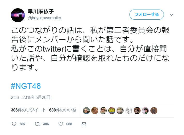 【速報】NGT48騒動 早川麻依子支配人「このつながりの話は、私が第三者委員会の報告後にメンバーから聞いた話です」【まいやん】 投稿日 2019年5月26日 23:56:28 (AKB関連) Tweet スポンサードリンク 続きを読む Source: AKB48タイムズ(AKB48まとめ) スポンサードリンク 続きを読む>> 最新情報 【朗報】AKB48のマレーシアイベント、大盛況で無事に終了!!! 【画像】この子アイドルで通用しますか?【HKT487期研究生 江浦優香13才】 【朗報】外ドラマ出演のAKB48山﨑空ちゃんの演技が上手いと話題に【あなたの恋人、強奪します。/そらら】 【朗報】近々新曲のMV撮影が行われる模様!【AKB48】 【朗報】19期研究生全員当たり!!!【AKB48劇場公演デビュー】 【朗報】ベルク×ニップン「AKB48 17期生 もちっとおいしいコラボキャンペーン」がスタート!!! 【速報】最新の久保怜音さんがキタ━━━━(゚∀゚)━━━━!!【元AKB48さとぴー】 【速報】STU48森下舞羽が卒業発表!!【まいはっち】 【AKB48】村山彩希さん、ついにインスタの個人アカウントを作る!!【ゆいリーInstagramデビュー】 【AKB48】クアラルンプール2日目、髙橋彩音ちゃんにぶっかけられて喜ぶ現地民をご覧下さい【マレーシア】 【悲報】地下アイドル現場怖い😱 女優業って正直ファンとしては辛い事ばかりで全然嬉しくないよね?【AKB48/SKE48/NMB48/HKT48/NGT48/STU48】 【朗報】元AKB48チームTP・邱品涵さん、福岡ソフトバンクホークスのチアガールに転身し大成功!!! 【AKB48】卒業記念生写真を出せるメンバーの基準ってどうなってんの? 【朗報】元AKB48奥原妃奈子さん、渋谷の大型ビジョンに現れる!【元チーム8ひーな】 昨日は岡田パッパの誕生日です【元AKB48岡田奈々】 【悲報】アイドルさん、ビラ配り中にまたしても酷い目に遭ってしまう【カリギュラのぶちあげイエロー担当ゆめぴりか】 【朗報】NGT48奈良未遥、ファースト写真集「こんな風に見られているのか?」7月1日発売決定!!! 【KLP48】クアラルンプール2日目に起こりそうなこと【AKB48】 今度こそ正真正銘のずっきーの谷間キタあああああ?【AKB48山内瑞葵】 【衝撃】松井珠理奈がアイドル復帰!マレーシア初の48姉妹グループ・KLP48プレイングマネージャーに就任決定!正式発表【元SKE48】 【AKB48】オリジナルステッカー販売終了のお知らせ【ピンポン玉チャレンジ】 【朗報】元馬嘉伶の真楪伶が1st写真集を発売決定!!【元AKB48・元まちゃりん・奇跡と出会った瞬間】 初めてAKB48劇場に入る私にアドバイス下さい!! スクエニ『トワツガイ』が僅か1年でサービス終了!大西桃香、渡辺みり愛、長谷川玲奈が実写化したのに【舞台化・元AKB48/元乃木坂46/元NGT48】 【悲報】=LOVE大谷映美里、体調不良のため本日の「個別お話し会」を欠席・・・【指原莉乃プロデュースアイドル・イコラブ・イコールラブ】 「ゆいずき」のダブルセンターというAKB48最強のカード【小栗有以・山内瑞葵】 【朗報】AKB48橋本陽菜、マレーシア移籍は断ったけど、旅行気分の数日間なら喜ぶ!!【はるぴょん】 【AKB48】メンバーが公演後に受け取ったファンレターをうpしてるのだが、どう思う? 【AKB48】正鋳真優「いつかAKBにチーム制を復活させたい」【まさるさん】 【テレビ】木村佳乃:「イッテQ!」に1年ぶり参戦で大暴れ! イモトアヤコとバトルも勃発 昔はネットがないから気になったCDを勘で買ったりしてたよな