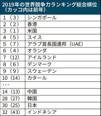 アジアではインドネシアの勢いが目立つ。総合順位は43位から32位に急浮上し、日本を猛追している。首都ジャカルタでは今春、同国初の地下鉄が開業するなど、インフラやビジネス環境の改善が寄与した。欧州では、欧州連合(EU)離脱に揺れる英国は23位と3つ順位を落とした。IMDは欧州の競争力は景気減速の影響で厳しくなっていると指摘した。