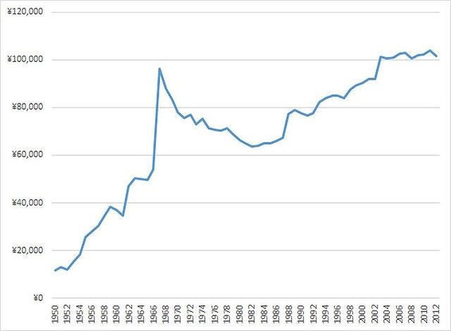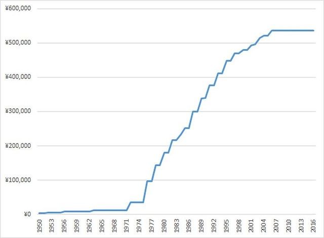 1970年代まで7~9万円で推移しており、この間は物価にあわせてスライドさせていたようです。これが1970年代後半から急激に上昇しています。