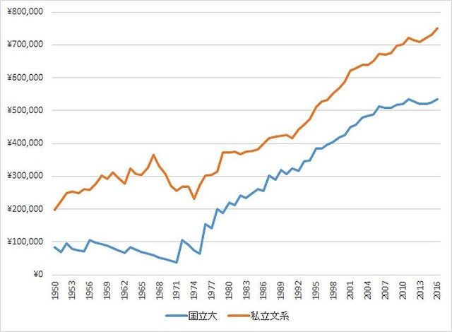 1970年代後半以降、国立大学が授業料を上げると、私立大学もこれに追随するように授業料を上げており、両者がイタチごっこのように授業料を上げています。