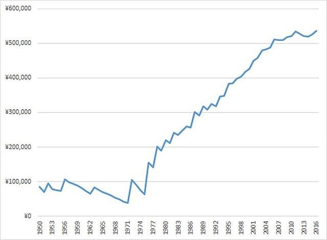 1950年に3600円だったものが、2016年は53万5800円まで、実に148.8倍も上昇しています。