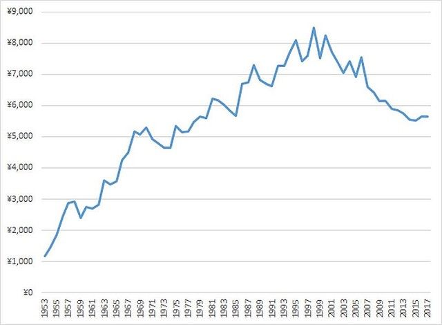 そんな授業料の急上昇のあおりを受けたのが、仕送り額です。家計調査によると2017年の仕送り額は年額5637円。