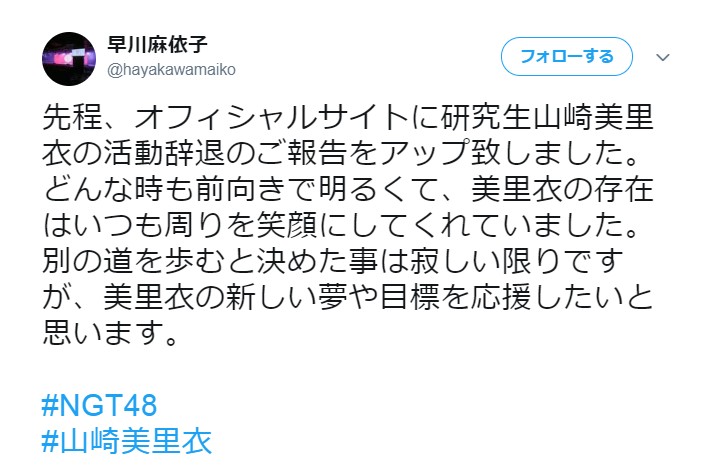 【NGT48騒動】支配人早川まいんちゃん「山崎美里衣の新しい夢や目標を応援したいと思います」←速攻リプ欄大荒れ・・・【早川麻依子支配人】 投稿日 2019年6月5日 12:52:08 (AKB関連) Tweet スポンサードリンク 続きを読む Source: AKB48タイムズ(AKB48まとめ) スポンサードリンク 続きを読む>> 最新情報 【朗報】AKB48のマレーシアイベント、大盛況で無事に終了!!! 【画像】この子アイドルで通用しますか?【HKT487期研究生 江浦優香13才】 【朗報】外ドラマ出演のAKB48山﨑空ちゃんの演技が上手いと話題に【あなたの恋人、強奪します。/そらら】 【朗報】近々新曲のMV撮影が行われる模様!【AKB48】 【朗報】19期研究生全員当たり!!!【AKB48劇場公演デビュー】 【朗報】ベルク×ニップン「AKB48 17期生 もちっとおいしいコラボキャンペーン」がスタート!!! 【速報】最新の久保怜音さんがキタ━━━━(゚∀゚)━━━━!!【元AKB48さとぴー】 【速報】STU48森下舞羽が卒業発表!!【まいはっち】 【AKB48】村山彩希さん、ついにインスタの個人アカウントを作る!!【ゆいリーInstagramデビュー】 【AKB48】クアラルンプール2日目、髙橋彩音ちゃんにぶっかけられて喜ぶ現地民をご覧下さい【マレーシア】 【悲報】地下アイドル現場怖い😱 女優業って正直ファンとしては辛い事ばかりで全然嬉しくないよね?【AKB48/SKE48/NMB48/HKT48/NGT48/STU48】 【朗報】元AKB48チームTP・邱品涵さん、福岡ソフトバンクホークスのチアガールに転身し大成功!!! 【AKB48】卒業記念生写真を出せるメンバーの基準ってどうなってんの? 【朗報】元AKB48奥原妃奈子さん、渋谷の大型ビジョンに現れる!【元チーム8ひーな】 昨日は岡田パッパの誕生日です【元AKB48岡田奈々】 【悲報】アイドルさん、ビラ配り中にまたしても酷い目に遭ってしまう【カリギュラのぶちあげイエロー担当ゆめぴりか】 【朗報】NGT48奈良未遥、ファースト写真集「こんな風に見られているのか?」7月1日発売決定!!! 【KLP48】クアラルンプール2日目に起こりそうなこと【AKB48】 今度こそ正真正銘のずっきーの谷間キタあああああ?【AKB48山内瑞葵】 【衝撃】松井珠理奈がアイドル復帰!マレーシア初の48姉妹グループ・KLP48プレイングマネージャーに就任決定!正式発表【元SKE48】 【AKB48】オリジナルステッカー販売終了のお知らせ【ピンポン玉チャレンジ】 【朗報】元馬嘉伶の真楪伶が1st写真集を発売決定!!【元AKB48・元まちゃりん・奇跡と出会った瞬間】 初めてAKB48劇場に入る私にアドバイス下さい!! スクエニ『トワツガイ』が僅か1年でサービス終了!大西桃香、渡辺みり愛、長谷川玲奈が実写化したのに【舞台化・元AKB48/元乃木坂46/元NGT48】 【悲報】=LOVE大谷映美里、体調不良のため本日の「個別お話し会」を欠席・・・【指原莉乃プロデュースアイドル・イコラブ・イコールラブ】 「ゆいずき」のダブルセンターというAKB48最強のカード【小栗有以・山内瑞葵】 【朗報】AKB48橋本陽菜、マレーシア移籍は断ったけど、旅行気分の数日間なら喜ぶ!!【はるぴょん】 【AKB48】メンバーが公演後に受け取ったファンレターをうpしてるのだが、どう思う? 【AKB48】正鋳真優「いつかAKBにチーム制を復活させたい」【まさるさん】 正直、亀梨クッソ好きなんやが 悲報 殺された事務次官の息子 ナンパの仕方がださすぎると話題に