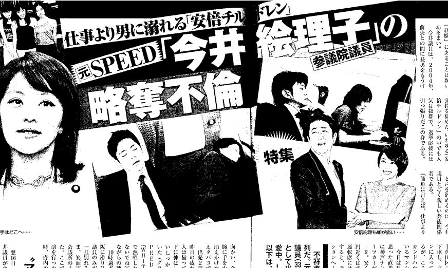 新潮。「元SPEED 今井絵理子参院議員の略奪不倫」。