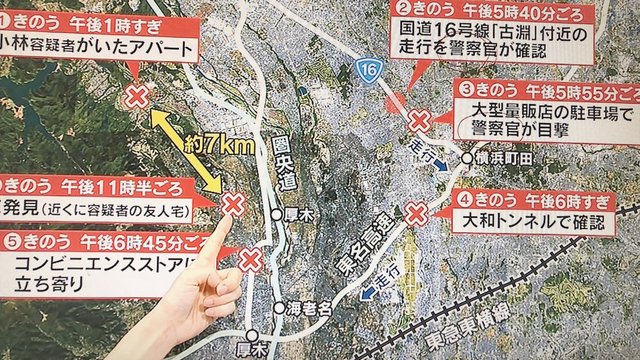 その後の捜査関係者への取材で、小林容疑者は車の発見現場から約3キロ離れた厚木市内のコンビニ店に立ち寄っていたことが新たに分かりました。横浜地検は公務執行妨害の疑いで逮捕状を取り、警察はまもなく全国指名手配にするとみられています。小林容疑者はこの厚木市内に土地勘があるとみられていて、警察はコンビニ店の近くの理髪店に立ち寄り、髪を切って風貌(ふうぼう)を変えて逃走している可能性があるとみて調べています。