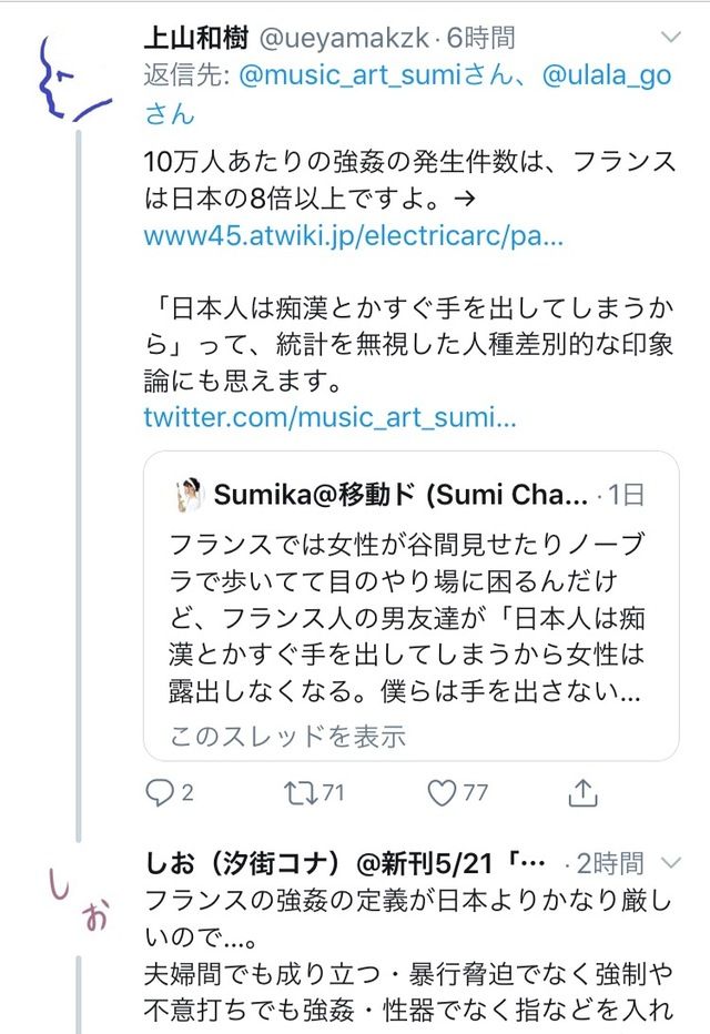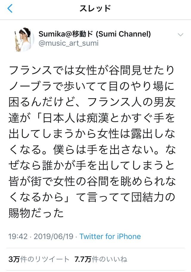 【悲報】まん「友人曰く、仏女性がセクシーな格好出来るのは性犯罪が少ないから」識者「日本の8倍ぞ」 まん「批判に返信はしません」