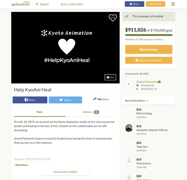 【速報】海外の京アニファン「京アニを救え」集金額が90万ドルを超える