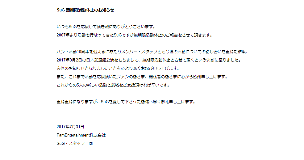 SuGが無期限の活動休止を発表 投稿日 2017年8月1日 01:05:40 (歌手・アーティスト) Tweet スポンサードリンク https://sug-web.jp/contents/111958 続きを読む Source: V系まとめ速報 スポンサードリンク 続きを読む>> 最新情報 アリアナ・グランデ、ファンからライヴでオートチューンを使っていると苦言を呈されたことに反論 【音楽】竹内まりや、39年ぶりのライブハウス公演決定!バンマスは山下達郎 ビートルズ『アビイ・ロード』50周年記念盤 9・27全世界同時発売決定 ピクシーズ、3年ぶりの来日公演が決定 パプリカで人気の米津玄師、YouTube公式チャンネル登録者数400万人突破 71歳小田和正「また会おう」55万人動員の1年3カ月ツアー完走 シンディ・ローパー来日公演、東京2デイズ即完につき追加公演が決定 「冷たいキス」ICE BOX、25年ぶり再結成 吉岡忍、伊秩弘将、中西圭三、池田聡らミニライブ開催 新曲も披露 スピッツの約3年ぶり新アルバム『見っけ』、10月リリース 細野晴臣ベストアルバム2作連続リリース、選曲は星野源&小山田圭吾 【音楽】HYDE、最初に買った音楽は「オフコース」意外?なオフコース愛告白「ラルクの初期の歌詞も、かなり影響を受けてる」 あいみょん、「マリーゴールド」が1億再生突破 こういうところでは嫌われがちだけど実際のところ星野源の音楽っていいよな 山下達郎、気管支炎のため中野サンプラザホール公演中止 【音楽】ザ・ドアーズ最初期のレア・ライヴ音源を収めたオフィシャル盤『London Fog 1966』 CD単品版発売 【音楽】三木道三改めDOZAN11、「新しい未来」配信 2019/07/10 【音楽】今年もボン・ジョヴィ「Livin' On A Prayer」で盆踊り?中野駅前大盆踊り大会開催決定 “盆ジョヴィ”再びか? ギターの音色が好きなギタリスト・嫌いなギタリスト 音楽よりTシャツだけが有名なバンド一覧 中学生でスティービーワンダーの音楽性に目覚めると言うのは異常かな?BOOOYとかは全く興味無かった 「EARTHSHAKER」ボーカル西田昌史還暦ライブにレジェンド集結 GLAYがFNSうたの夏まつりに出演。『サバイバル』を披露するそうです。 陰キャ「RADは『君の名は。』まで無名だった」 中島みゆきってめっちゃいい曲作るやん 好きなV系の曲を BUMPで最大の名曲 【悲報】ワイ、女の子にカラオケで『Lemon』の替え歌告白するもフラれる・・・ HEY-SMITHの猪狩秀平、尿管結石と診断され自宅療養→セカンドオピニオンで肺気胸と判明し、即入院で手術。 お前ら「アジカンはいいぞ」ワイ「けしてえええええ!の一発屋」 米津玄師の新曲「馬と鹿」が大泉洋主演ドラマ「ノーサイド・ゲーム」主題歌に 可愛すぎて「本気すぎるコスプレ公務員」《動画》「バナナ姫ルナ」 ジャンヌ・モロー死去-フランスの大大大女優「死刑台のエレベーター」など
