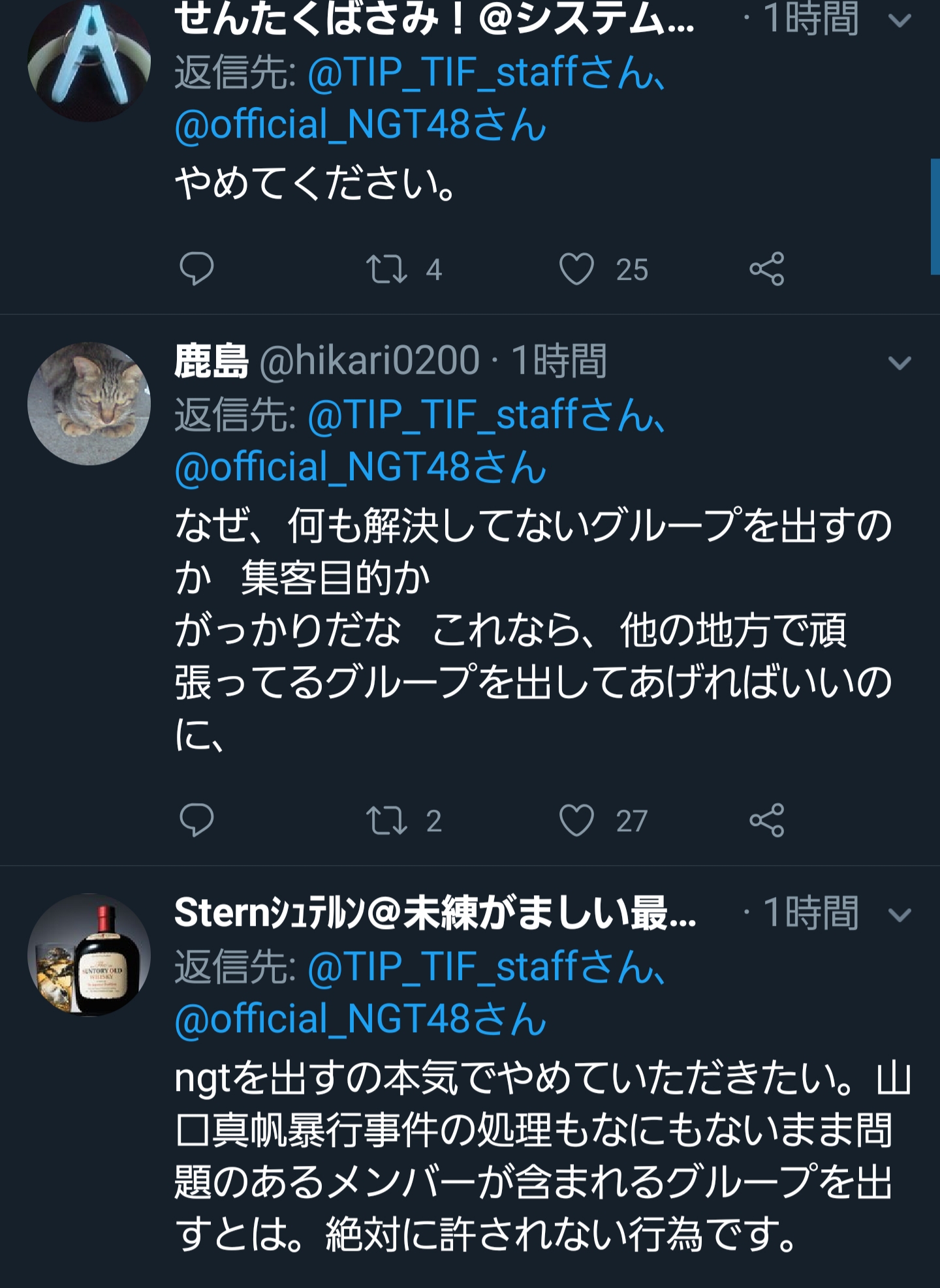 【悲報】NGT48の出演を発表したTIF公式Twitterに「TIFを汚すな!」とアイドルファンからクレーム殺到・・・ 投稿日 2019年8月2日 10:55:46 (AKB関連) Tweet スポンサードリンク 続きを読む Source: AKB48タイムズ(AKB48まとめ) スポンサードリンク 続きを読む>> 最新情報 【朗報】AKB48のマレーシアイベント、大盛況で無事に終了!!! 【画像】この子アイドルで通用しますか?【HKT487期研究生 江浦優香13才】 【朗報】外ドラマ出演のAKB48山﨑空ちゃんの演技が上手いと話題に【あなたの恋人、強奪します。/そらら】 【朗報】近々新曲のMV撮影が行われる模様!【AKB48】 【朗報】19期研究生全員当たり!!!【AKB48劇場公演デビュー】 【朗報】ベルク×ニップン「AKB48 17期生 もちっとおいしいコラボキャンペーン」がスタート!!! 【速報】最新の久保怜音さんがキタ━━━━(゚∀゚)━━━━!!【元AKB48さとぴー】 【速報】STU48森下舞羽が卒業発表!!【まいはっち】 【AKB48】村山彩希さん、ついにインスタの個人アカウントを作る!!【ゆいリーInstagramデビュー】 【AKB48】クアラルンプール2日目、髙橋彩音ちゃんにぶっかけられて喜ぶ現地民をご覧下さい【マレーシア】 【悲報】地下アイドル現場怖い😱 女優業って正直ファンとしては辛い事ばかりで全然嬉しくないよね?【AKB48/SKE48/NMB48/HKT48/NGT48/STU48】 【朗報】元AKB48チームTP・邱品涵さん、福岡ソフトバンクホークスのチアガールに転身し大成功!!! 【AKB48】卒業記念生写真を出せるメンバーの基準ってどうなってんの? 【朗報】元AKB48奥原妃奈子さん、渋谷の大型ビジョンに現れる!【元チーム8ひーな】 昨日は岡田パッパの誕生日です【元AKB48岡田奈々】 【悲報】アイドルさん、ビラ配り中にまたしても酷い目に遭ってしまう【カリギュラのぶちあげイエロー担当ゆめぴりか】 【朗報】NGT48奈良未遥、ファースト写真集「こんな風に見られているのか?」7月1日発売決定!!! 【KLP48】クアラルンプール2日目に起こりそうなこと【AKB48】 今度こそ正真正銘のずっきーの谷間キタあああああ?【AKB48山内瑞葵】 【衝撃】松井珠理奈がアイドル復帰!マレーシア初の48姉妹グループ・KLP48プレイングマネージャーに就任決定!正式発表【元SKE48】 【AKB48】オリジナルステッカー販売終了のお知らせ【ピンポン玉チャレンジ】 【朗報】元馬嘉伶の真楪伶が1st写真集を発売決定!!【元AKB48・元まちゃりん・奇跡と出会った瞬間】 初めてAKB48劇場に入る私にアドバイス下さい!! スクエニ『トワツガイ』が僅か1年でサービス終了!大西桃香、渡辺みり愛、長谷川玲奈が実写化したのに【舞台化・元AKB48/元乃木坂46/元NGT48】 【悲報】=LOVE大谷映美里、体調不良のため本日の「個別お話し会」を欠席・・・【指原莉乃プロデュースアイドル・イコラブ・イコールラブ】 「ゆいずき」のダブルセンターというAKB48最強のカード【小栗有以・山内瑞葵】 【朗報】AKB48橋本陽菜、マレーシア移籍は断ったけど、旅行気分の数日間なら喜ぶ!!【はるぴょん】 【AKB48】メンバーが公演後に受け取ったファンレターをうpしてるのだが、どう思う? 【AKB48】正鋳真優「いつかAKBにチーム制を復活させたい」【まさるさん】 【悲報】ファミペイさん、7payを煽ってしまう… 【芸能】<浅川梨奈>歩行中に一般女性から肘鉄をみぞおちにくらい「都会の人怖いよ…」