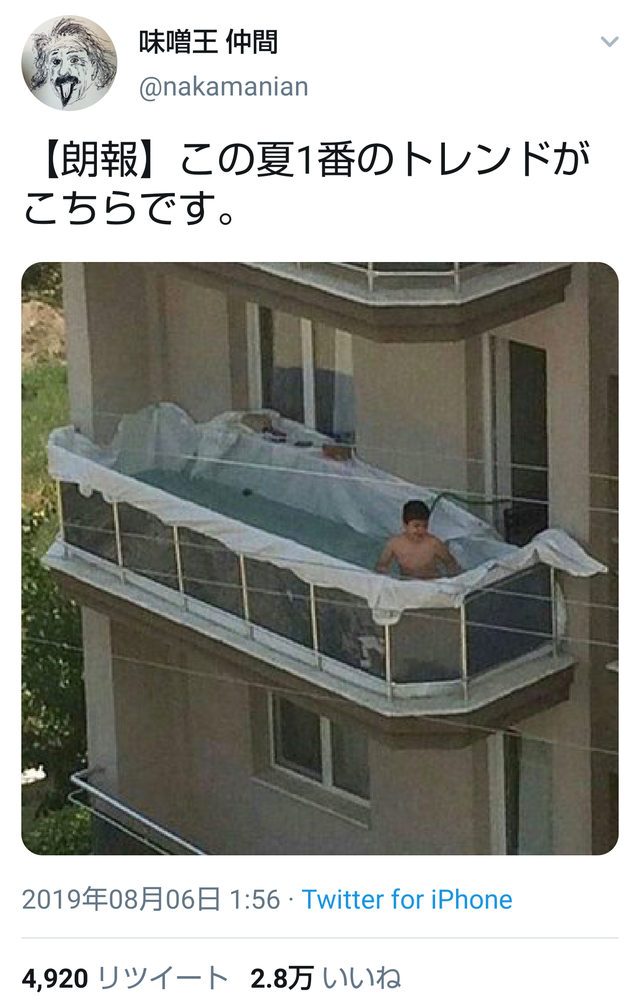 【悲報】DQNさんの間でベランダ全体をプールにするのがトレンドに……水の重さでベランダ崩落の危険性