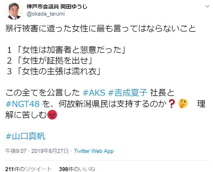 【NGT48暴行事件】AKS吉成夏子社長、文春砲の件で神戸市会議員岡田ゆうじから批判される!!!!! 投稿日 2019年8月28日 07:01:35 (AKB関連) Tweet スポンサードリンク 続きを読む Source: AKB48タイムズ(AKB48まとめ) スポンサードリンク 続きを読む>> 最新情報 【朗報】AKB48のマレーシアイベント、大盛況で無事に終了!!! 【画像】この子アイドルで通用しますか?【HKT487期研究生 江浦優香13才】 【朗報】外ドラマ出演のAKB48山﨑空ちゃんの演技が上手いと話題に【あなたの恋人、強奪します。/そらら】 【朗報】近々新曲のMV撮影が行われる模様!【AKB48】 【朗報】19期研究生全員当たり!!!【AKB48劇場公演デビュー】 【朗報】ベルク×ニップン「AKB48 17期生 もちっとおいしいコラボキャンペーン」がスタート!!! 【速報】最新の久保怜音さんがキタ━━━━(゚∀゚)━━━━!!【元AKB48さとぴー】 【速報】STU48森下舞羽が卒業発表!!【まいはっち】 【AKB48】村山彩希さん、ついにインスタの個人アカウントを作る!!【ゆいリーInstagramデビュー】 【AKB48】クアラルンプール2日目、髙橋彩音ちゃんにぶっかけられて喜ぶ現地民をご覧下さい【マレーシア】 【悲報】地下アイドル現場怖い😱 女優業って正直ファンとしては辛い事ばかりで全然嬉しくないよね?【AKB48/SKE48/NMB48/HKT48/NGT48/STU48】 【朗報】元AKB48チームTP・邱品涵さん、福岡ソフトバンクホークスのチアガールに転身し大成功!!! 【AKB48】卒業記念生写真を出せるメンバーの基準ってどうなってんの? 【朗報】元AKB48奥原妃奈子さん、渋谷の大型ビジョンに現れる!【元チーム8ひーな】 昨日は岡田パッパの誕生日です【元AKB48岡田奈々】 【悲報】アイドルさん、ビラ配り中にまたしても酷い目に遭ってしまう【カリギュラのぶちあげイエロー担当ゆめぴりか】 【朗報】NGT48奈良未遥、ファースト写真集「こんな風に見られているのか?」7月1日発売決定!!! 【KLP48】クアラルンプール2日目に起こりそうなこと【AKB48】 今度こそ正真正銘のずっきーの谷間キタあああああ?【AKB48山内瑞葵】 【衝撃】松井珠理奈がアイドル復帰!マレーシア初の48姉妹グループ・KLP48プレイングマネージャーに就任決定!正式発表【元SKE48】 【AKB48】オリジナルステッカー販売終了のお知らせ【ピンポン玉チャレンジ】 【朗報】元馬嘉伶の真楪伶が1st写真集を発売決定!!【元AKB48・元まちゃりん・奇跡と出会った瞬間】 初めてAKB48劇場に入る私にアドバイス下さい!! スクエニ『トワツガイ』が僅か1年でサービス終了!大西桃香、渡辺みり愛、長谷川玲奈が実写化したのに【舞台化・元AKB48/元乃木坂46/元NGT48】 【悲報】=LOVE大谷映美里、体調不良のため本日の「個別お話し会」を欠席・・・【指原莉乃プロデュースアイドル・イコラブ・イコールラブ】 「ゆいずき」のダブルセンターというAKB48最強のカード【小栗有以・山内瑞葵】 【朗報】AKB48橋本陽菜、マレーシア移籍は断ったけど、旅行気分の数日間なら喜ぶ!!【はるぴょん】 【AKB48】メンバーが公演後に受け取ったファンレターをうpしてるのだが、どう思う? 【AKB48】正鋳真優「いつかAKBにチーム制を復活させたい」【まさるさん】 【画像あり】日本一かわいい高校一年生が決定!! キムタクが学生とバーミヤンで食事会www