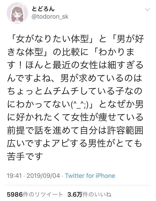 純粋に男は自分の好み体型語ってるだけなのに勝手に勘違いして許容範囲広いアピールやと決め付けるのやめーや