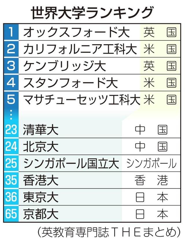日本勢の首位は東大の36位で昨年の42位から順位を上げたが、アジアでは5位にとどまった。京大は昨年と同じ65位だった。