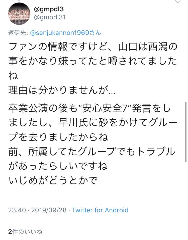 【NGT48暴行事件】NGTオタ「山口真帆は何らかの精神的な障害を抱えてる可能性もある」【人望民】 投稿日 2019年10月1日 05:41:51 (AKB関連) Tweet スポンサードリンク 続きを読む Source: AKB48タイムズ(AKB48まとめ) スポンサードリンク 続きを読む>> 最新情報 【朗報】AKB48のマレーシアイベント、大盛況で無事に終了!!! 【画像】この子アイドルで通用しますか?【HKT487期研究生 江浦優香13才】 【朗報】外ドラマ出演のAKB48山﨑空ちゃんの演技が上手いと話題に【あなたの恋人、強奪します。/そらら】 【朗報】近々新曲のMV撮影が行われる模様!【AKB48】 【朗報】19期研究生全員当たり!!!【AKB48劇場公演デビュー】 【朗報】ベルク×ニップン「AKB48 17期生 もちっとおいしいコラボキャンペーン」がスタート!!! 【速報】最新の久保怜音さんがキタ━━━━(゚∀゚)━━━━!!【元AKB48さとぴー】 【速報】STU48森下舞羽が卒業発表!!【まいはっち】 【AKB48】村山彩希さん、ついにインスタの個人アカウントを作る!!【ゆいリーInstagramデビュー】 【AKB48】クアラルンプール2日目、髙橋彩音ちゃんにぶっかけられて喜ぶ現地民をご覧下さい【マレーシア】 【悲報】地下アイドル現場怖い😱 女優業って正直ファンとしては辛い事ばかりで全然嬉しくないよね?【AKB48/SKE48/NMB48/HKT48/NGT48/STU48】 【朗報】元AKB48チームTP・邱品涵さん、福岡ソフトバンクホークスのチアガールに転身し大成功!!! 【AKB48】卒業記念生写真を出せるメンバーの基準ってどうなってんの? 【朗報】元AKB48奥原妃奈子さん、渋谷の大型ビジョンに現れる!【元チーム8ひーな】 昨日は岡田パッパの誕生日です【元AKB48岡田奈々】 【悲報】アイドルさん、ビラ配り中にまたしても酷い目に遭ってしまう【カリギュラのぶちあげイエロー担当ゆめぴりか】 【朗報】NGT48奈良未遥、ファースト写真集「こんな風に見られているのか?」7月1日発売決定!!! 【KLP48】クアラルンプール2日目に起こりそうなこと【AKB48】 今度こそ正真正銘のずっきーの谷間キタあああああ?【AKB48山内瑞葵】 【衝撃】松井珠理奈がアイドル復帰!マレーシア初の48姉妹グループ・KLP48プレイングマネージャーに就任決定!正式発表【元SKE48】 【AKB48】オリジナルステッカー販売終了のお知らせ【ピンポン玉チャレンジ】 【朗報】元馬嘉伶の真楪伶が1st写真集を発売決定!!【元AKB48・元まちゃりん・奇跡と出会った瞬間】 初めてAKB48劇場に入る私にアドバイス下さい!! スクエニ『トワツガイ』が僅か1年でサービス終了!大西桃香、渡辺みり愛、長谷川玲奈が実写化したのに【舞台化・元AKB48/元乃木坂46/元NGT48】 【悲報】=LOVE大谷映美里、体調不良のため本日の「個別お話し会」を欠席・・・【指原莉乃プロデュースアイドル・イコラブ・イコールラブ】 「ゆいずき」のダブルセンターというAKB48最強のカード【小栗有以・山内瑞葵】 【朗報】AKB48橋本陽菜、マレーシア移籍は断ったけど、旅行気分の数日間なら喜ぶ!!【はるぴょん】 【AKB48】メンバーが公演後に受け取ったファンレターをうpしてるのだが、どう思う? 【AKB48】正鋳真優「いつかAKBにチーム制を復活させたい」【まさるさん】 【画像】真上から見たニューヨークがコチラ アインシュタイン稲田がモテまくり!空前の「ブサイク芸人」ブームが到来