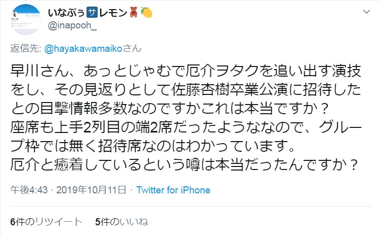 【NGT48暴行事件】早川麻依子支配人、いなぷぅさレモンにも追い込まれる?【稲岡龍之介】 投稿日 2019年10月12日 11:23:21 (AKB関連) Tweet スポンサードリンク 続きを読む Source: AKB48タイムズ(AKB48まとめ) スポンサードリンク 続きを読む>> 最新情報 【朗報】AKB48のマレーシアイベント、大盛況で無事に終了!!! 【画像】この子アイドルで通用しますか?【HKT487期研究生 江浦優香13才】 【朗報】外ドラマ出演のAKB48山﨑空ちゃんの演技が上手いと話題に【あなたの恋人、強奪します。/そらら】 【朗報】近々新曲のMV撮影が行われる模様!【AKB48】 【朗報】19期研究生全員当たり!!!【AKB48劇場公演デビュー】 【朗報】ベルク×ニップン「AKB48 17期生 もちっとおいしいコラボキャンペーン」がスタート!!! 【速報】最新の久保怜音さんがキタ━━━━(゚∀゚)━━━━!!【元AKB48さとぴー】 【速報】STU48森下舞羽が卒業発表!!【まいはっち】 【AKB48】村山彩希さん、ついにインスタの個人アカウントを作る!!【ゆいリーInstagramデビュー】 【AKB48】クアラルンプール2日目、髙橋彩音ちゃんにぶっかけられて喜ぶ現地民をご覧下さい【マレーシア】 【悲報】地下アイドル現場怖い😱 女優業って正直ファンとしては辛い事ばかりで全然嬉しくないよね?【AKB48/SKE48/NMB48/HKT48/NGT48/STU48】 【朗報】元AKB48チームTP・邱品涵さん、福岡ソフトバンクホークスのチアガールに転身し大成功!!! 【AKB48】卒業記念生写真を出せるメンバーの基準ってどうなってんの? 【朗報】元AKB48奥原妃奈子さん、渋谷の大型ビジョンに現れる!【元チーム8ひーな】 昨日は岡田パッパの誕生日です【元AKB48岡田奈々】 【悲報】アイドルさん、ビラ配り中にまたしても酷い目に遭ってしまう【カリギュラのぶちあげイエロー担当ゆめぴりか】 【朗報】NGT48奈良未遥、ファースト写真集「こんな風に見られているのか?」7月1日発売決定!!! 【KLP48】クアラルンプール2日目に起こりそうなこと【AKB48】 今度こそ正真正銘のずっきーの谷間キタあああああ?【AKB48山内瑞葵】 【衝撃】松井珠理奈がアイドル復帰!マレーシア初の48姉妹グループ・KLP48プレイングマネージャーに就任決定!正式発表【元SKE48】 【AKB48】オリジナルステッカー販売終了のお知らせ【ピンポン玉チャレンジ】 【朗報】元馬嘉伶の真楪伶が1st写真集を発売決定!!【元AKB48・元まちゃりん・奇跡と出会った瞬間】 初めてAKB48劇場に入る私にアドバイス下さい!! スクエニ『トワツガイ』が僅か1年でサービス終了!大西桃香、渡辺みり愛、長谷川玲奈が実写化したのに【舞台化・元AKB48/元乃木坂46/元NGT48】 【悲報】=LOVE大谷映美里、体調不良のため本日の「個別お話し会」を欠席・・・【指原莉乃プロデュースアイドル・イコラブ・イコールラブ】 「ゆいずき」のダブルセンターというAKB48最強のカード【小栗有以・山内瑞葵】 【朗報】AKB48橋本陽菜、マレーシア移籍は断ったけど、旅行気分の数日間なら喜ぶ!!【はるぴょん】 【AKB48】メンバーが公演後に受け取ったファンレターをうpしてるのだが、どう思う? 【AKB48】正鋳真優「いつかAKBにチーム制を復活させたい」【まさるさん】 【NGT48暴行事件】有識者「あの録音データの内容の何が一番まずいかって繋がりなんかぶっちゃけどうでもよくてスタッフが犯人を庇ってること」 【芸能】“恐喝女”木下優樹菜を擁護した鈴木紗理奈に炎上が飛び火…「状況判断できてなくて草。芸能界こわたん」