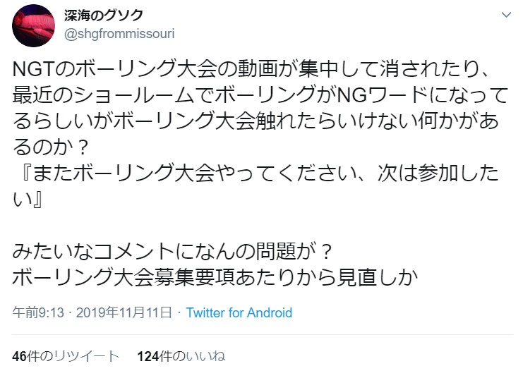 【疑問】NGT48メンバーのSHOWROOMで「ボーリング」がNGワードになってしまう。一体なぜ? 投稿日 2019年11月12日 11:35:44 (AKB関連) Tweet スポンサードリンク 続きを読む Source: AKB48タイムズ(AKB48まとめ) スポンサードリンク 続きを読む>> 最新情報 【朗報】AKB48のマレーシアイベント、大盛況で無事に終了!!! 【画像】この子アイドルで通用しますか?【HKT487期研究生 江浦優香13才】 【朗報】外ドラマ出演のAKB48山﨑空ちゃんの演技が上手いと話題に【あなたの恋人、強奪します。/そらら】 【朗報】近々新曲のMV撮影が行われる模様!【AKB48】 【朗報】19期研究生全員当たり!!!【AKB48劇場公演デビュー】 【朗報】ベルク×ニップン「AKB48 17期生 もちっとおいしいコラボキャンペーン」がスタート!!! 【速報】最新の久保怜音さんがキタ━━━━(゚∀゚)━━━━!!【元AKB48さとぴー】 【速報】STU48森下舞羽が卒業発表!!【まいはっち】 【AKB48】村山彩希さん、ついにインスタの個人アカウントを作る!!【ゆいリーInstagramデビュー】 【AKB48】クアラルンプール2日目、髙橋彩音ちゃんにぶっかけられて喜ぶ現地民をご覧下さい【マレーシア】 【悲報】地下アイドル現場怖い😱 女優業って正直ファンとしては辛い事ばかりで全然嬉しくないよね?【AKB48/SKE48/NMB48/HKT48/NGT48/STU48】 【朗報】元AKB48チームTP・邱品涵さん、福岡ソフトバンクホークスのチアガールに転身し大成功!!! 【AKB48】卒業記念生写真を出せるメンバーの基準ってどうなってんの? 【朗報】元AKB48奥原妃奈子さん、渋谷の大型ビジョンに現れる!【元チーム8ひーな】 昨日は岡田パッパの誕生日です【元AKB48岡田奈々】 【悲報】アイドルさん、ビラ配り中にまたしても酷い目に遭ってしまう【カリギュラのぶちあげイエロー担当ゆめぴりか】 【朗報】NGT48奈良未遥、ファースト写真集「こんな風に見られているのか?」7月1日発売決定!!! 【KLP48】クアラルンプール2日目に起こりそうなこと【AKB48】 今度こそ正真正銘のずっきーの谷間キタあああああ?【AKB48山内瑞葵】 【衝撃】松井珠理奈がアイドル復帰!マレーシア初の48姉妹グループ・KLP48プレイングマネージャーに就任決定!正式発表【元SKE48】 【AKB48】オリジナルステッカー販売終了のお知らせ【ピンポン玉チャレンジ】 【朗報】元馬嘉伶の真楪伶が1st写真集を発売決定!!【元AKB48・元まちゃりん・奇跡と出会った瞬間】 初めてAKB48劇場に入る私にアドバイス下さい!! スクエニ『トワツガイ』が僅か1年でサービス終了!大西桃香、渡辺みり愛、長谷川玲奈が実写化したのに【舞台化・元AKB48/元乃木坂46/元NGT48】 【悲報】=LOVE大谷映美里、体調不良のため本日の「個別お話し会」を欠席・・・【指原莉乃プロデュースアイドル・イコラブ・イコールラブ】 「ゆいずき」のダブルセンターというAKB48最強のカード【小栗有以・山内瑞葵】 【朗報】AKB48橋本陽菜、マレーシア移籍は断ったけど、旅行気分の数日間なら喜ぶ!!【はるぴょん】 【AKB48】メンバーが公演後に受け取ったファンレターをうpしてるのだが、どう思う? 【AKB48】正鋳真優「いつかAKBにチーム制を復活させたい」【まさるさん】 後藤真希のインスタがHすぎるwwwwww このコスプレイヤー可愛すぎるwwwww