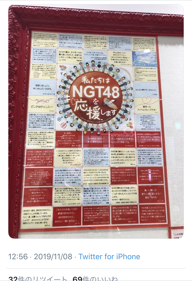 【画像】有識者「久しぶりにNGT48劇場覗いたらこんなのが飾ってあってドン引いた。ほんとやめて」 投稿日 2019年11月13日 14:59:34 (AKB関連) Tweet スポンサードリンク 続きを読む Source: AKB48タイムズ(AKB48まとめ) スポンサードリンク 続きを読む>> 最新情報 【朗報】AKB48のマレーシアイベント、大盛況で無事に終了!!! 【画像】この子アイドルで通用しますか?【HKT487期研究生 江浦優香13才】 【朗報】外ドラマ出演のAKB48山﨑空ちゃんの演技が上手いと話題に【あなたの恋人、強奪します。/そらら】 【朗報】近々新曲のMV撮影が行われる模様!【AKB48】 【朗報】19期研究生全員当たり!!!【AKB48劇場公演デビュー】 【朗報】ベルク×ニップン「AKB48 17期生 もちっとおいしいコラボキャンペーン」がスタート!!! 【速報】最新の久保怜音さんがキタ━━━━(゚∀゚)━━━━!!【元AKB48さとぴー】 【速報】STU48森下舞羽が卒業発表!!【まいはっち】 【AKB48】村山彩希さん、ついにインスタの個人アカウントを作る!!【ゆいリーInstagramデビュー】 【AKB48】クアラルンプール2日目、髙橋彩音ちゃんにぶっかけられて喜ぶ現地民をご覧下さい【マレーシア】 【悲報】地下アイドル現場怖い😱 女優業って正直ファンとしては辛い事ばかりで全然嬉しくないよね?【AKB48/SKE48/NMB48/HKT48/NGT48/STU48】 【朗報】元AKB48チームTP・邱品涵さん、福岡ソフトバンクホークスのチアガールに転身し大成功!!! 【AKB48】卒業記念生写真を出せるメンバーの基準ってどうなってんの? 【朗報】元AKB48奥原妃奈子さん、渋谷の大型ビジョンに現れる!【元チーム8ひーな】 昨日は岡田パッパの誕生日です【元AKB48岡田奈々】 【悲報】アイドルさん、ビラ配り中にまたしても酷い目に遭ってしまう【カリギュラのぶちあげイエロー担当ゆめぴりか】 【朗報】NGT48奈良未遥、ファースト写真集「こんな風に見られているのか?」7月1日発売決定!!! 【KLP48】クアラルンプール2日目に起こりそうなこと【AKB48】 今度こそ正真正銘のずっきーの谷間キタあああああ?【AKB48山内瑞葵】 【衝撃】松井珠理奈がアイドル復帰!マレーシア初の48姉妹グループ・KLP48プレイングマネージャーに就任決定!正式発表【元SKE48】 【AKB48】オリジナルステッカー販売終了のお知らせ【ピンポン玉チャレンジ】 【朗報】元馬嘉伶の真楪伶が1st写真集を発売決定!!【元AKB48・元まちゃりん・奇跡と出会った瞬間】 初めてAKB48劇場に入る私にアドバイス下さい!! スクエニ『トワツガイ』が僅か1年でサービス終了!大西桃香、渡辺みり愛、長谷川玲奈が実写化したのに【舞台化・元AKB48/元乃木坂46/元NGT48】 【悲報】=LOVE大谷映美里、体調不良のため本日の「個別お話し会」を欠席・・・【指原莉乃プロデュースアイドル・イコラブ・イコールラブ】 「ゆいずき」のダブルセンターというAKB48最強のカード【小栗有以・山内瑞葵】 【朗報】AKB48橋本陽菜、マレーシア移籍は断ったけど、旅行気分の数日間なら喜ぶ!!【はるぴょん】 【AKB48】メンバーが公演後に受け取ったファンレターをうpしてるのだが、どう思う? 【AKB48】正鋳真優「いつかAKBにチーム制を復活させたい」【まさるさん】 柏木由紀(28才)が今夜のベストヒット歌謡祭で発表しそうなことは何?【卒業発表か?】 【速報】広瀬すずは巨乳、広瀬すずは巨乳