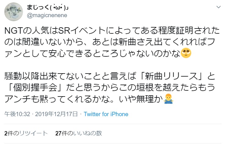 NGT48ファン「NGTの人気はSRイベントによってある程度証明された あとは新曲さえ出てくれればファンとして安心できる」 投稿日 2019年12月19日 09:23:32 (AKB関連) Tweet スポンサードリンク 続きを読む Source: AKB48タイムズ(AKB48まとめ) スポンサードリンク 続きを読む>> 最新情報 【朗報】AKB48のマレーシアイベント、大盛況で無事に終了!!! 【画像】この子アイドルで通用しますか?【HKT487期研究生 江浦優香13才】 【朗報】外ドラマ出演のAKB48山﨑空ちゃんの演技が上手いと話題に【あなたの恋人、強奪します。/そらら】 【朗報】近々新曲のMV撮影が行われる模様!【AKB48】 【朗報】19期研究生全員当たり!!!【AKB48劇場公演デビュー】 【朗報】ベルク×ニップン「AKB48 17期生 もちっとおいしいコラボキャンペーン」がスタート!!! 【速報】最新の久保怜音さんがキタ━━━━(゚∀゚)━━━━!!【元AKB48さとぴー】 【速報】STU48森下舞羽が卒業発表!!【まいはっち】 【AKB48】村山彩希さん、ついにインスタの個人アカウントを作る!!【ゆいリーInstagramデビュー】 【AKB48】クアラルンプール2日目、髙橋彩音ちゃんにぶっかけられて喜ぶ現地民をご覧下さい【マレーシア】 【悲報】地下アイドル現場怖い😱 女優業って正直ファンとしては辛い事ばかりで全然嬉しくないよね?【AKB48/SKE48/NMB48/HKT48/NGT48/STU48】 【朗報】元AKB48チームTP・邱品涵さん、福岡ソフトバンクホークスのチアガールに転身し大成功!!! 【AKB48】卒業記念生写真を出せるメンバーの基準ってどうなってんの? 【朗報】元AKB48奥原妃奈子さん、渋谷の大型ビジョンに現れる!【元チーム8ひーな】 昨日は岡田パッパの誕生日です【元AKB48岡田奈々】 【悲報】アイドルさん、ビラ配り中にまたしても酷い目に遭ってしまう【カリギュラのぶちあげイエロー担当ゆめぴりか】 【朗報】NGT48奈良未遥、ファースト写真集「こんな風に見られているのか?」7月1日発売決定!!! 【KLP48】クアラルンプール2日目に起こりそうなこと【AKB48】 今度こそ正真正銘のずっきーの谷間キタあああああ?【AKB48山内瑞葵】 【衝撃】松井珠理奈がアイドル復帰!マレーシア初の48姉妹グループ・KLP48プレイングマネージャーに就任決定!正式発表【元SKE48】 【AKB48】オリジナルステッカー販売終了のお知らせ【ピンポン玉チャレンジ】 【朗報】元馬嘉伶の真楪伶が1st写真集を発売決定!!【元AKB48・元まちゃりん・奇跡と出会った瞬間】 初めてAKB48劇場に入る私にアドバイス下さい!! スクエニ『トワツガイ』が僅か1年でサービス終了!大西桃香、渡辺みり愛、長谷川玲奈が実写化したのに【舞台化・元AKB48/元乃木坂46/元NGT48】 【悲報】=LOVE大谷映美里、体調不良のため本日の「個別お話し会」を欠席・・・【指原莉乃プロデュースアイドル・イコラブ・イコールラブ】 「ゆいずき」のダブルセンターというAKB48最強のカード【小栗有以・山内瑞葵】 【朗報】AKB48橋本陽菜、マレーシア移籍は断ったけど、旅行気分の数日間なら喜ぶ!!【はるぴょん】 【AKB48】メンバーが公演後に受け取ったファンレターをうpしてるのだが、どう思う? 【AKB48】正鋳真優「いつかAKBにチーム制を復活させたい」【まさるさん】 お前らが始めてみたときに「こいつら一発屋っぽいな」と思ったのにずっと消えない芸人 【悲報】リクアワ投票、クレカ決済には投票権なし【AKB48グループリクエストアワー セットリストベスト50 2020】