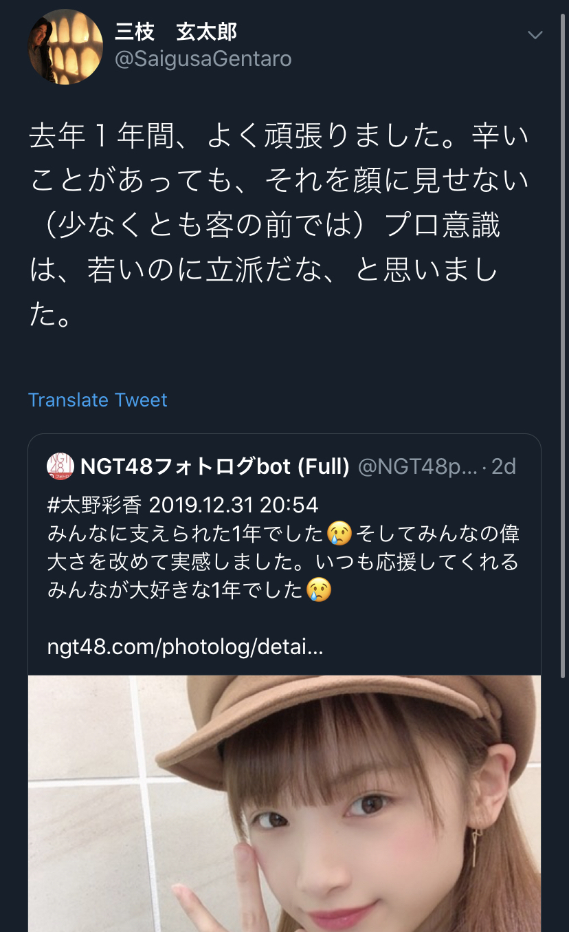 元産経記者の三枝玄太郎さん、事件で炎上したNGT48太野彩花のフォトログbotにリプ「この1年よく頑張りました。辛いことがあっても…立派。」 投稿日 2020年1月4日 11:59:34 (AKB関連) Tweet スポンサードリンク 続きを読む Source: AKB48タイムズ(AKB48まとめ) スポンサードリンク 続きを読む>> 最新情報 【朗報】AKB48のマレーシアイベント、大盛況で無事に終了!!! 【画像】この子アイドルで通用しますか?【HKT487期研究生 江浦優香13才】 【朗報】外ドラマ出演のAKB48山﨑空ちゃんの演技が上手いと話題に【あなたの恋人、強奪します。/そらら】 【朗報】近々新曲のMV撮影が行われる模様!【AKB48】 【朗報】19期研究生全員当たり!!!【AKB48劇場公演デビュー】 【朗報】ベルク×ニップン「AKB48 17期生 もちっとおいしいコラボキャンペーン」がスタート!!! 【速報】最新の久保怜音さんがキタ━━━━(゚∀゚)━━━━!!【元AKB48さとぴー】 【速報】STU48森下舞羽が卒業発表!!【まいはっち】 【AKB48】村山彩希さん、ついにインスタの個人アカウントを作る!!【ゆいリーInstagramデビュー】 【AKB48】クアラルンプール2日目、髙橋彩音ちゃんにぶっかけられて喜ぶ現地民をご覧下さい【マレーシア】 【悲報】地下アイドル現場怖い😱 女優業って正直ファンとしては辛い事ばかりで全然嬉しくないよね?【AKB48/SKE48/NMB48/HKT48/NGT48/STU48】 【朗報】元AKB48チームTP・邱品涵さん、福岡ソフトバンクホークスのチアガールに転身し大成功!!! 【AKB48】卒業記念生写真を出せるメンバーの基準ってどうなってんの? 【朗報】元AKB48奥原妃奈子さん、渋谷の大型ビジョンに現れる!【元チーム8ひーな】 昨日は岡田パッパの誕生日です【元AKB48岡田奈々】 【悲報】アイドルさん、ビラ配り中にまたしても酷い目に遭ってしまう【カリギュラのぶちあげイエロー担当ゆめぴりか】 【朗報】NGT48奈良未遥、ファースト写真集「こんな風に見られているのか?」7月1日発売決定!!! 【KLP48】クアラルンプール2日目に起こりそうなこと【AKB48】 今度こそ正真正銘のずっきーの谷間キタあああああ?【AKB48山内瑞葵】 【衝撃】松井珠理奈がアイドル復帰!マレーシア初の48姉妹グループ・KLP48プレイングマネージャーに就任決定!正式発表【元SKE48】 【AKB48】オリジナルステッカー販売終了のお知らせ【ピンポン玉チャレンジ】 【朗報】元馬嘉伶の真楪伶が1st写真集を発売決定!!【元AKB48・元まちゃりん・奇跡と出会った瞬間】 初めてAKB48劇場に入る私にアドバイス下さい!! スクエニ『トワツガイ』が僅か1年でサービス終了!大西桃香、渡辺みり愛、長谷川玲奈が実写化したのに【舞台化・元AKB48/元乃木坂46/元NGT48】 【悲報】=LOVE大谷映美里、体調不良のため本日の「個別お話し会」を欠席・・・【指原莉乃プロデュースアイドル・イコラブ・イコールラブ】 「ゆいずき」のダブルセンターというAKB48最強のカード【小栗有以・山内瑞葵】 【朗報】AKB48橋本陽菜、マレーシア移籍は断ったけど、旅行気分の数日間なら喜ぶ!!【はるぴょん】 【AKB48】メンバーが公演後に受け取ったファンレターをうpしてるのだが、どう思う? 【AKB48】正鋳真優「いつかAKBにチーム制を復活させたい」【まさるさん】 【SKE48】須田亜香里「(鼻毛さらしや鼻フックをやったのは)アイドルグループとしての振り幅が広い一面を伝えたかったんです」【あかりん】 ローラのぷるぷる乳