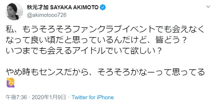 元AKB48秋元才加「もうファンクラブイベントでも会えなくなって良い頃だと思っているんだけど皆どう?いつまでも会えるアイドルでいて欲しい?」 投稿日 2020年1月9日 22:48:59 (AKB関連) Tweet スポンサードリンク 続きを読む Source: AKB48タイムズ(AKB48まとめ) スポンサードリンク 続きを読む>> 最新情報 【朗報】AKB48のマレーシアイベント、大盛況で無事に終了!!! 【画像】この子アイドルで通用しますか?【HKT487期研究生 江浦優香13才】 【朗報】外ドラマ出演のAKB48山﨑空ちゃんの演技が上手いと話題に【あなたの恋人、強奪します。/そらら】 【朗報】近々新曲のMV撮影が行われる模様!【AKB48】 【朗報】19期研究生全員当たり!!!【AKB48劇場公演デビュー】 【朗報】ベルク×ニップン「AKB48 17期生 もちっとおいしいコラボキャンペーン」がスタート!!! 【速報】最新の久保怜音さんがキタ━━━━(゚∀゚)━━━━!!【元AKB48さとぴー】 【速報】STU48森下舞羽が卒業発表!!【まいはっち】 【AKB48】村山彩希さん、ついにインスタの個人アカウントを作る!!【ゆいリーInstagramデビュー】 【AKB48】クアラルンプール2日目、髙橋彩音ちゃんにぶっかけられて喜ぶ現地民をご覧下さい【マレーシア】 【悲報】地下アイドル現場怖い😱 女優業って正直ファンとしては辛い事ばかりで全然嬉しくないよね?【AKB48/SKE48/NMB48/HKT48/NGT48/STU48】 【朗報】元AKB48チームTP・邱品涵さん、福岡ソフトバンクホークスのチアガールに転身し大成功!!! 【AKB48】卒業記念生写真を出せるメンバーの基準ってどうなってんの? 【朗報】元AKB48奥原妃奈子さん、渋谷の大型ビジョンに現れる!【元チーム8ひーな】 昨日は岡田パッパの誕生日です【元AKB48岡田奈々】 【悲報】アイドルさん、ビラ配り中にまたしても酷い目に遭ってしまう【カリギュラのぶちあげイエロー担当ゆめぴりか】 【朗報】NGT48奈良未遥、ファースト写真集「こんな風に見られているのか?」7月1日発売決定!!! 【KLP48】クアラルンプール2日目に起こりそうなこと【AKB48】 今度こそ正真正銘のずっきーの谷間キタあああああ?【AKB48山内瑞葵】 【衝撃】松井珠理奈がアイドル復帰!マレーシア初の48姉妹グループ・KLP48プレイングマネージャーに就任決定!正式発表【元SKE48】 【AKB48】オリジナルステッカー販売終了のお知らせ【ピンポン玉チャレンジ】 【朗報】元馬嘉伶の真楪伶が1st写真集を発売決定!!【元AKB48・元まちゃりん・奇跡と出会った瞬間】 初めてAKB48劇場に入る私にアドバイス下さい!! スクエニ『トワツガイ』が僅か1年でサービス終了!大西桃香、渡辺みり愛、長谷川玲奈が実写化したのに【舞台化・元AKB48/元乃木坂46/元NGT48】 【悲報】=LOVE大谷映美里、体調不良のため本日の「個別お話し会」を欠席・・・【指原莉乃プロデュースアイドル・イコラブ・イコールラブ】 「ゆいずき」のダブルセンターというAKB48最強のカード【小栗有以・山内瑞葵】 【朗報】AKB48橋本陽菜、マレーシア移籍は断ったけど、旅行気分の数日間なら喜ぶ!!【はるぴょん】 【AKB48】メンバーが公演後に受け取ったファンレターをうpしてるのだが、どう思う? 【AKB48】正鋳真優「いつかAKBにチーム制を復活させたい」【まさるさん】 【悲報】乃木坂46オタが怒り爆発「スキャンダル松村沙友理が居座り、ノースキャンダルのまいやんが卒業…松村が先に卒業しろ」【白石麻衣】 ネタやってるところ見たことない芸人